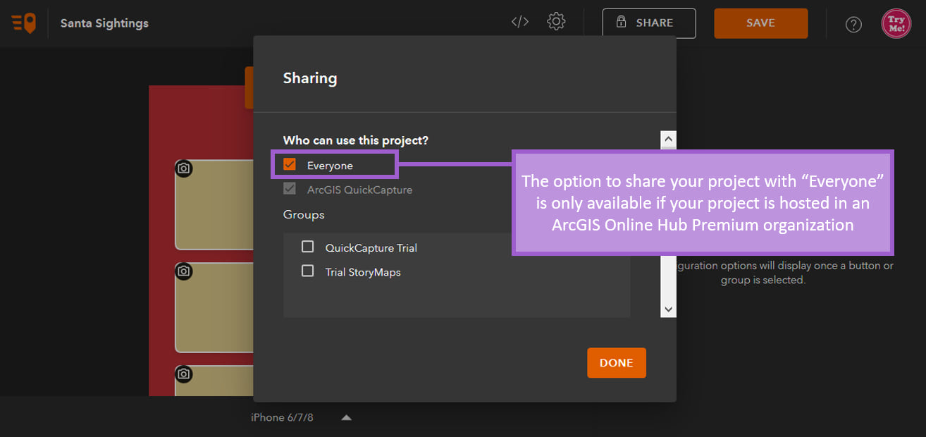 The way this works is simple: If your ArcGIS Online organization is licensed with ArcGIS Hub Premium, the sharing dialog within the QuickCapture designer unlocks the share with Everyone option.