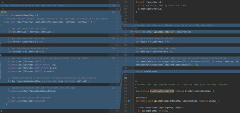 The above changes result in the new updateCalendar() method to become significantly shorter than the original updateTimeOfDay() method seen in the image below. Furthermore, the entire application contains sixteen lines less of code because of using properties. As observed in these examples, incorporating JavaFX properties and bindings into your applications can significantly improve code readability and increase developer productivity. This is particularly noticeable when figuring out which UI controls modify the underlying data of your application.