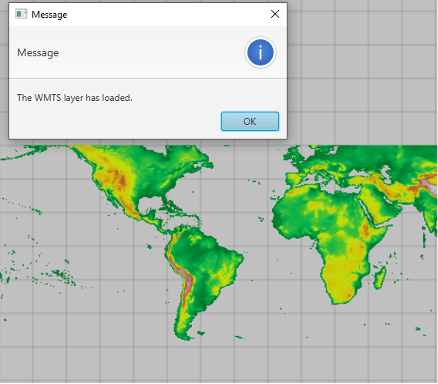 The Web Map Tile Service Layer (WMTS) sample registers a change listener to the WMTS service load status property in favour of using a done loading listener. This can be achieved by using the property object addListener() method which enables listening for load status changes to run the appropriate code depending on the property value. The values of this property are “LOADED”, “NOT_LOADED”, “LOADING”, or “FAILED_TO_LOAD” status. If the value of the property changes to “LOADED” then an alert is displayed and the WMTS layer is displayed as the basemap (see image below). However, if the service is in “FAILED_TO_LOAD” status, then an alert is displayed with information obtained from the value of the WMTS service loadErrorProperty().