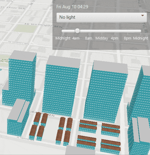 The sunLightingProperty() can have “NO_LIGHT”, “LIGHT”, and “LIGHT_AND_SHADOWS” values which are the options displayed in the combo box to control the ambient light and shadows in the application. Additionally, a default selection value for the combo box is required because the sunLightingProperty() is a non-nullable property.