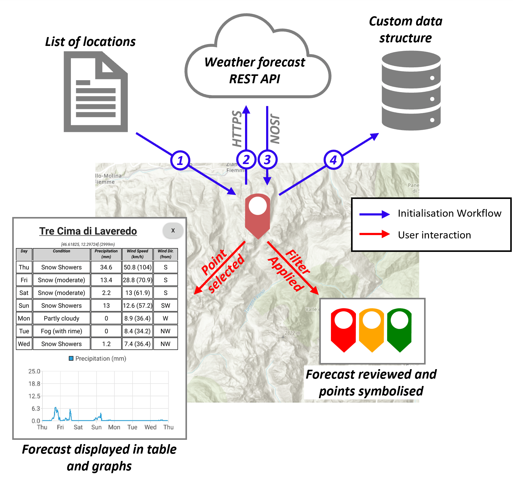 Once the initialisation workflow has been completed, forecast data is available for each mountain and the application is ready for user-interactions.