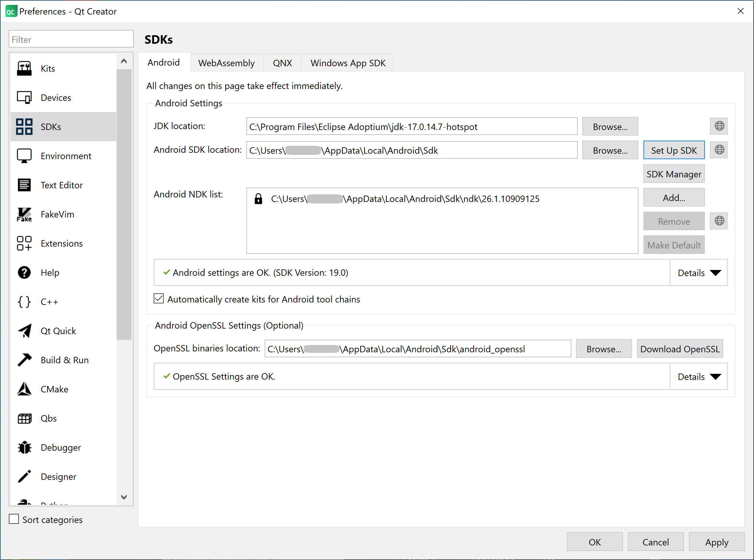 Additionally, as part of your development machines configuration to deploy on Android devices, you should ensure that you meet the minimum requirements in the document System requirements page in the Deploying apps to Android section. In my case, I have the following installed and configured in Qt Creator: Android JDK version 17.0.14.7, Android NDK version 26.1.10909125, and Android SDK version 19.0. You should ensure that your Qt Creator has similar settings by choosing Edit > Preferences from the menus. In the Preferences – Qt Creator dialog for the SDKs category with the Android tab active make sure you have all green checkmarks (no red X’s) and that each textbox is filled out with valid configuration settings.