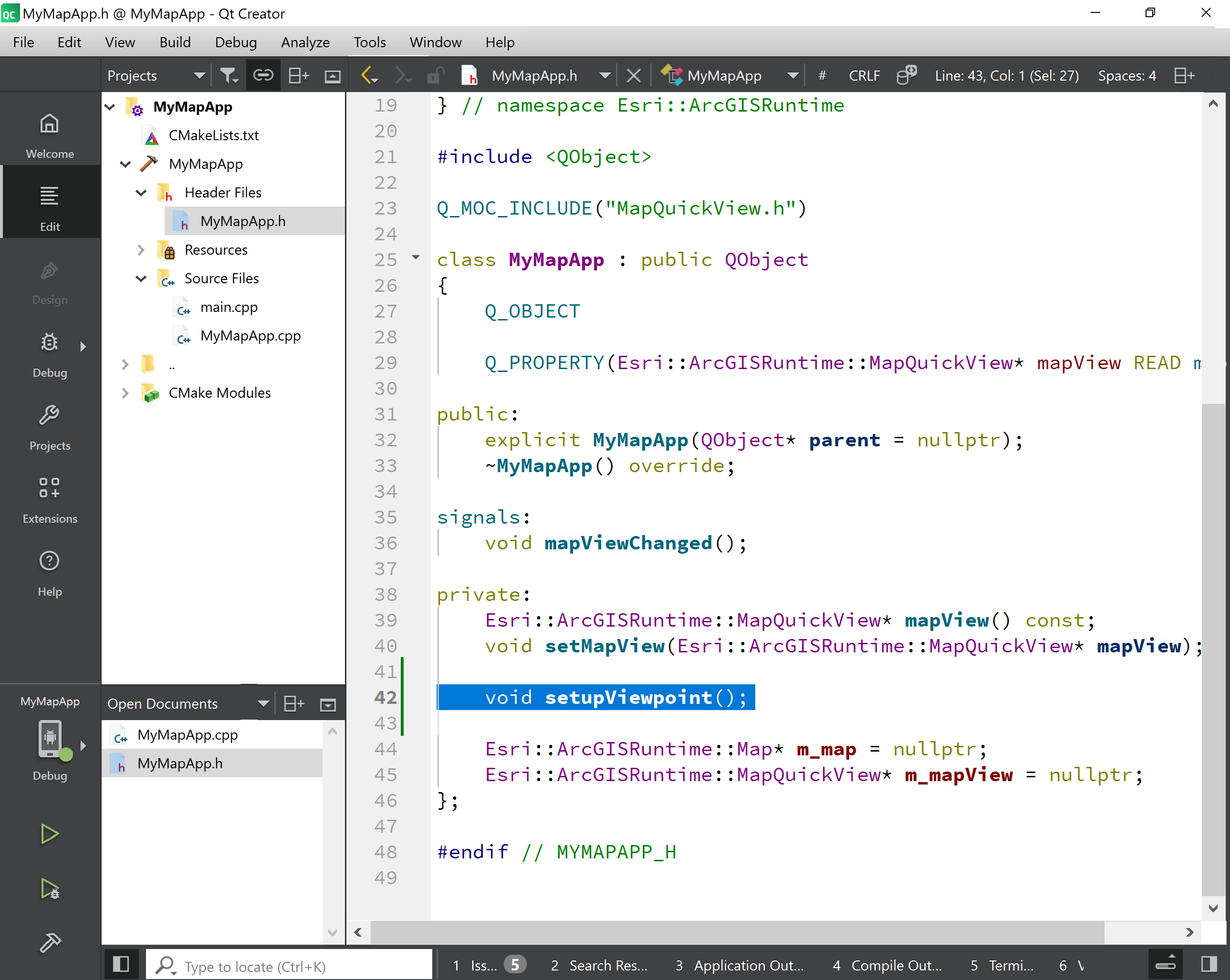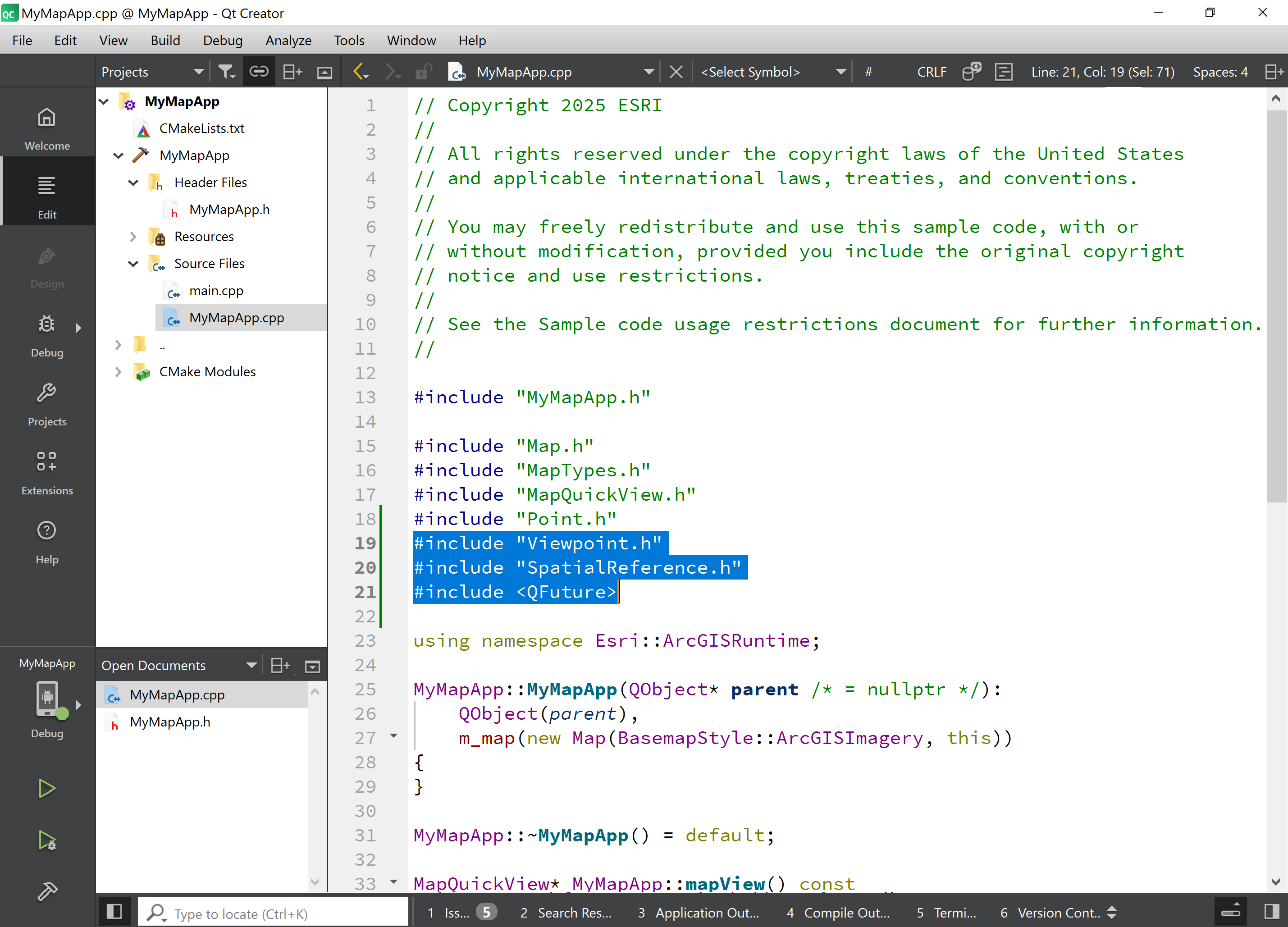 Now let’s write some C++ code in Qt Creator to have your app to do something interesting like zoom to a specific location on the map. The code steps are very similar to the Display a map tutorial in the ArcGIS Maps SDK for Qt documentation.
