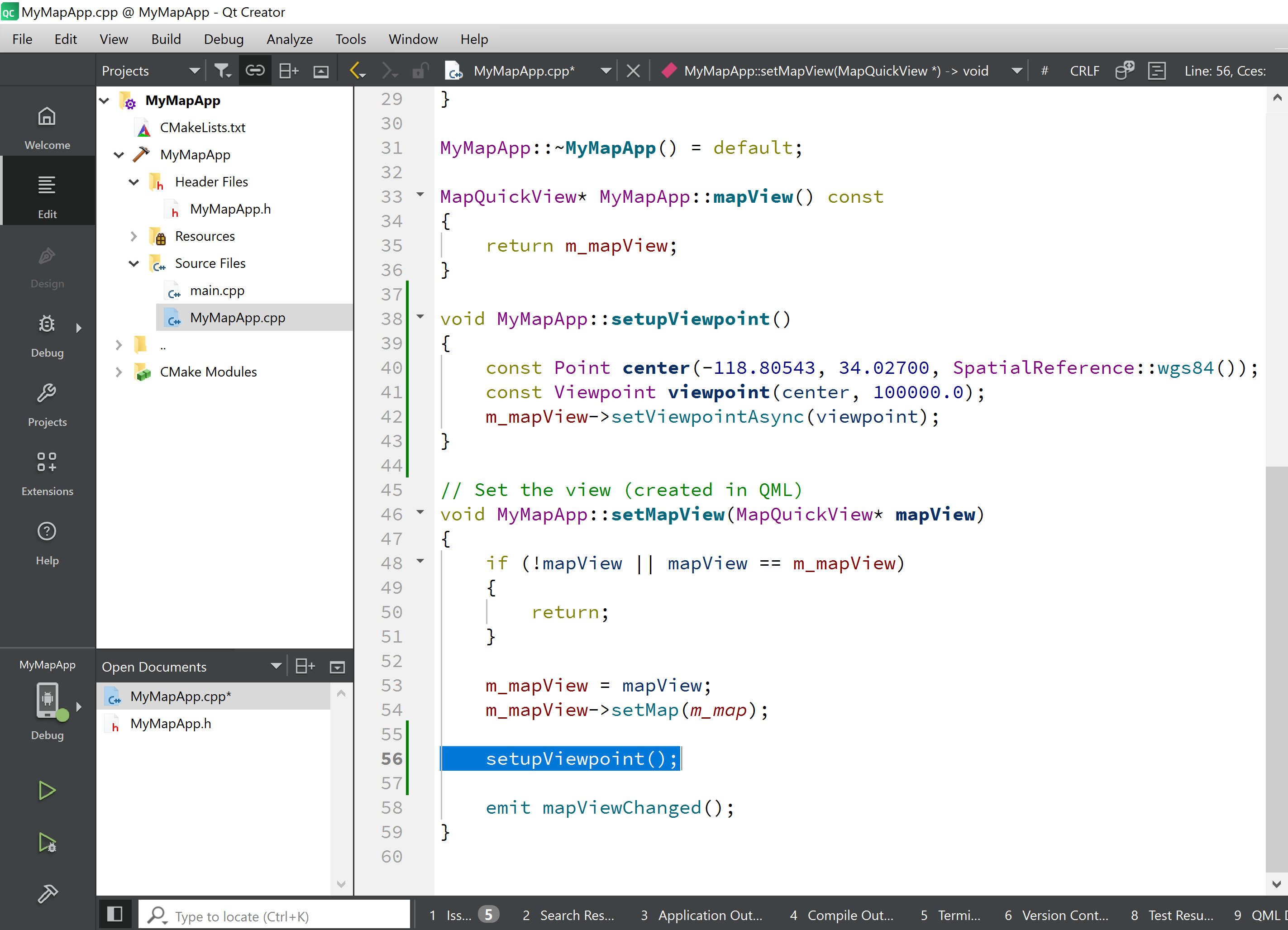 The final code change we will make in the MyMapApp.cpp file is to call the setupViewpoint() function from within the existing MyMapApp::setupMapView(MapQuickView* mapView) function.