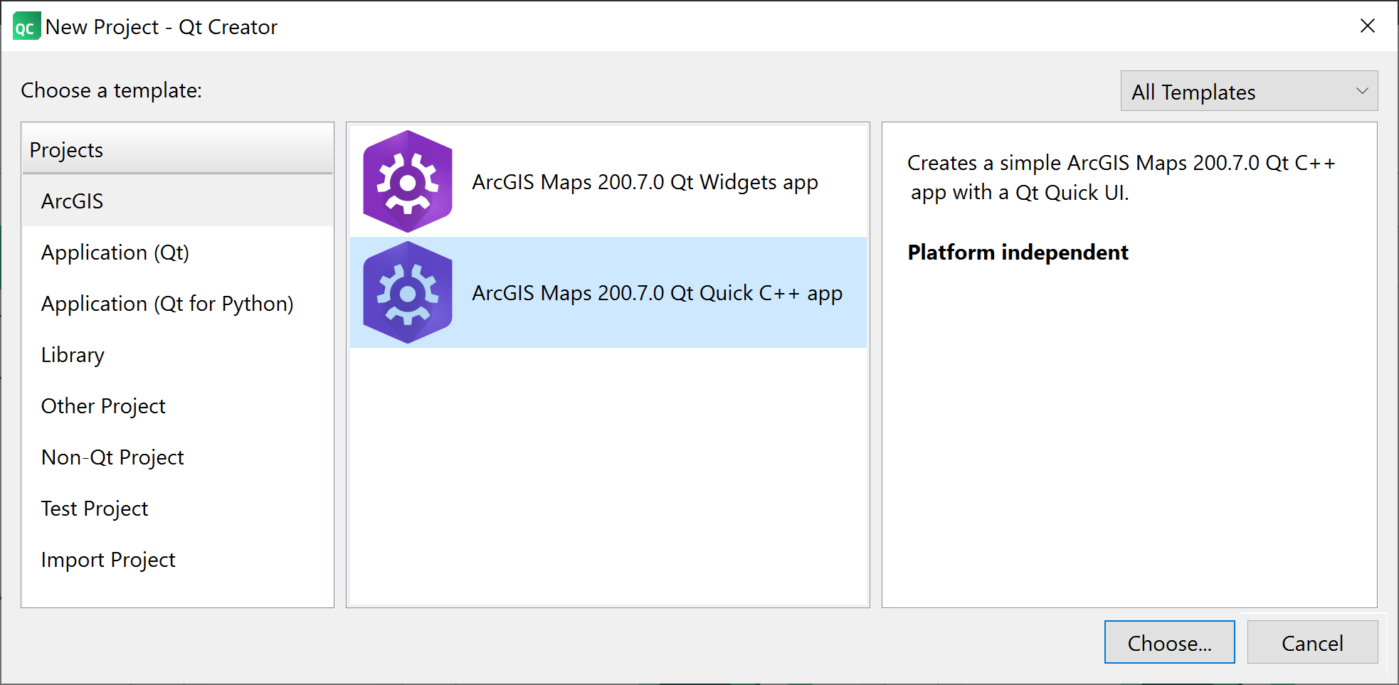 With your Android device developer mode and your device connected to the Windows desktop via a USB cord, launch Qt Creator. Choose File > New Project from the menus. This will launch the New Project – Qt Creator wizard. Select the ArcGIS tab and then click on the ArcGIS Maps 200.7 Qt Quick C++ app and click the Choose button.