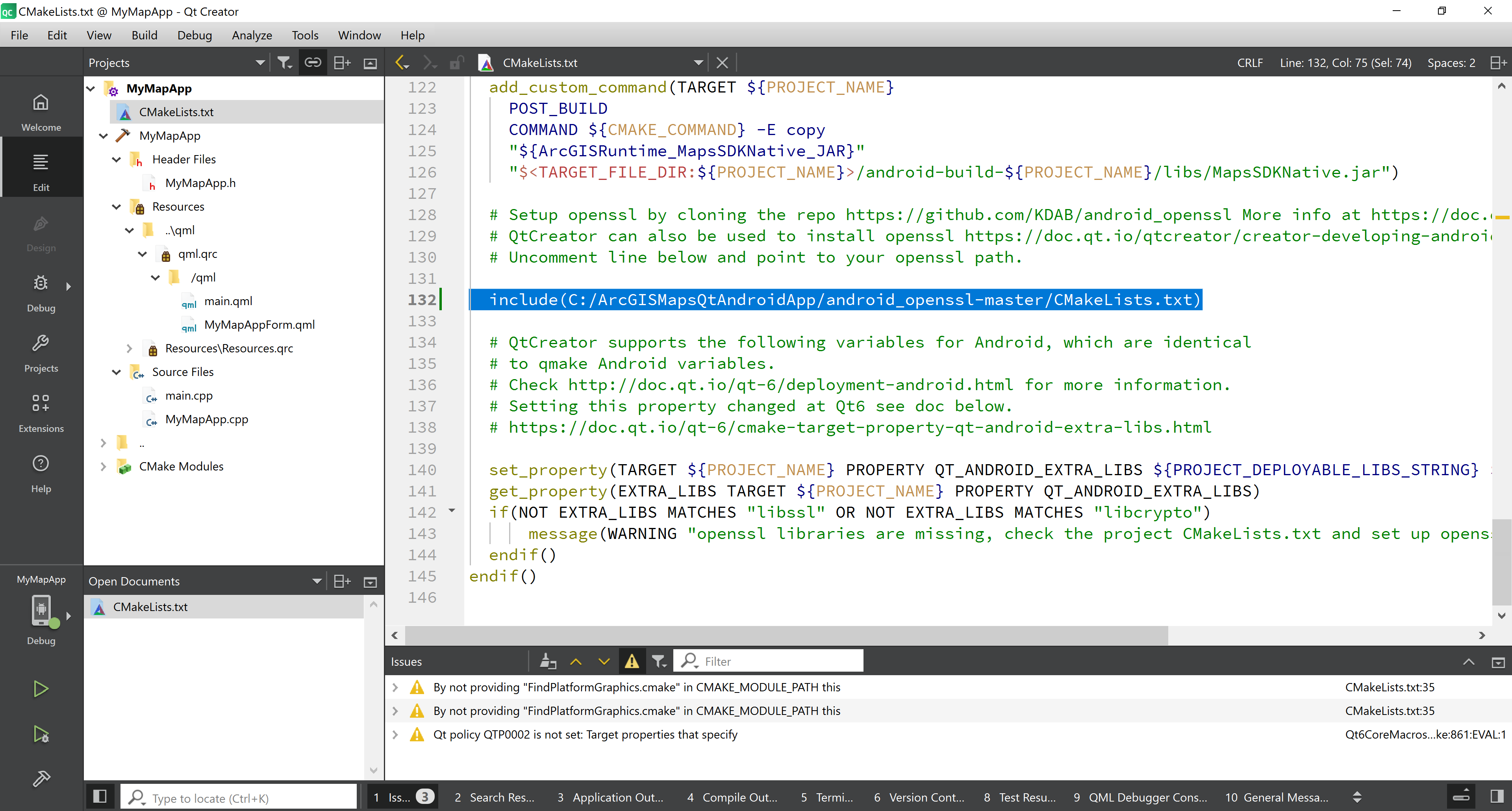 In the Projects pane, click on the MyMapApp debug icon and you should see similar information display depending on your device an build kit configuration: