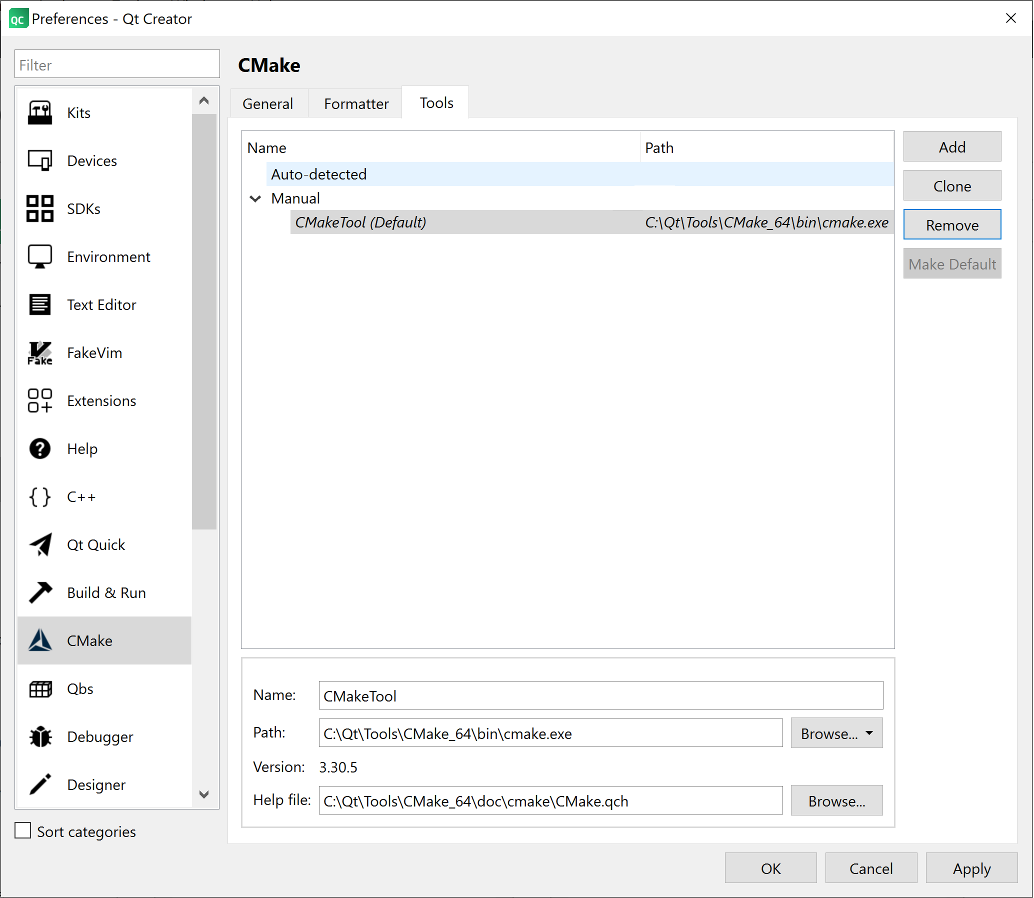 The build system we will use within Qt Creator to compile our C++ code is CMake. The ArcGIS Maps SDK for Qt documentation Install and set up in the Install on Windows section has a sub section called “Install CMake” that has useful links to configure CMake in Qt Creator. In a nutshell, you need to download the Windows version of the binaries from the CMake organization and install them on your Windows desktop. In my case, I chose the cmake_4.0.1-windows-x86.zip file and unzipped the contents in my Qt installation folder. Then in Qt Creator, I chose Edit > Preferences from the menus. In the Preferences – Qt Creator dialog for the CMake category, make the Tools tab active. Click the Add button fill-in the information for the Name, Path, and Help file textboxes. When you are done, you should see something like this: