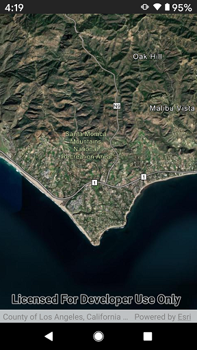 You are now ready to build and deploy your changes to the Android device. Do this in the menus by clicking Build > Run. You should see your app open zoomed to the Santa Monica mountains in California.