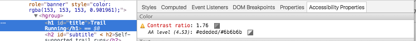 Inspect opens the developer tools with the element that contains the text highlighted to allow you to inspect the properties. Click the Accessibility Properties tab and view the contrast ratio. I like this tool because it shows you the current contrast ratio and if your colors don’t meet the criteria it suggests alternate colors that do.