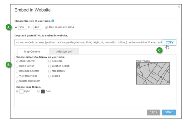 Tip: Keep Allow responsive sizing checked to ensure your map remains in the same aspect ratio when embedding into a responsively designed website.