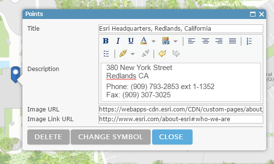 When you search for an address, place, or coordinate, you can add the result to a new or existing map notes layer in your map. Map notes are saved with your map, and only you can edit them. The map note “dot” can include a simple title, or can be embellished to include descriptive text, images, links, and more. Map notes also include other useful graphic objects, such as polygons, lines, geometric shapes, text, and more.