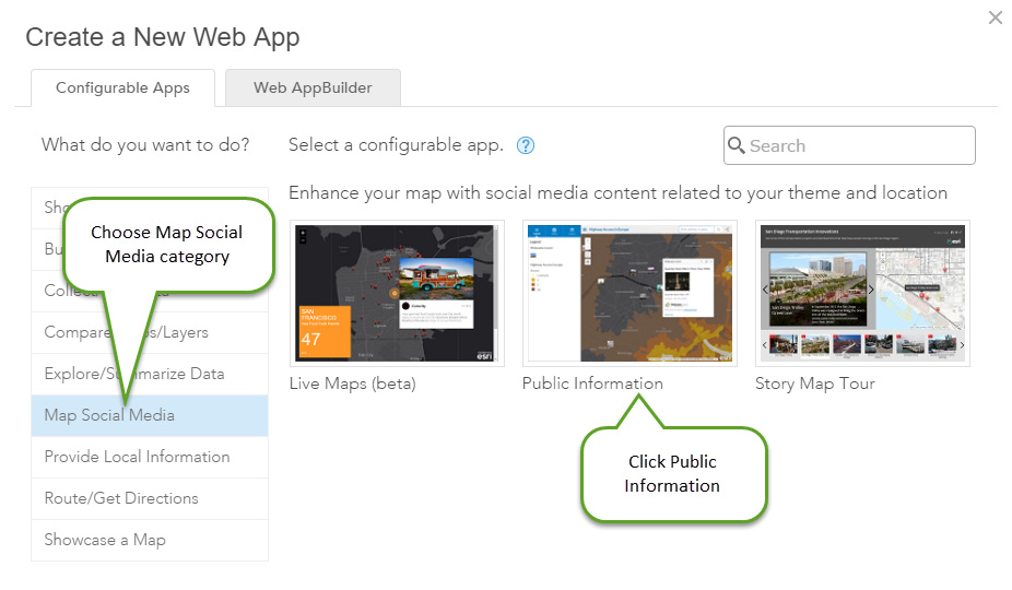 Step 2. Choose the Map Social Media category in the app gallery, then click the Public Information app.