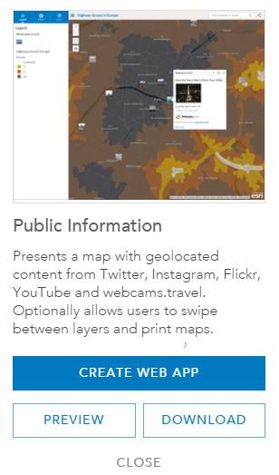 Public Information is a fully configurable and responsive template that adapts to any form factor – browser, tablet, or phone. It includes the ability to map tweets and other geolocated social content from Instagram, Flickr, YouTube, and Webcams.travel. The template can be configured to automatically include a search string to retrieve geolocated tweets, and other social media options can be similarly configured, or can be removed. Here’s how to use Public Information for Twitter.