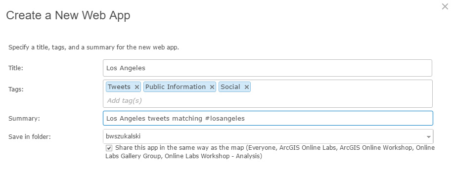Click Save when finished configuring the app. Note that when testing the app you must login to your Twitter account and authorize ArcGIS access if you’ve not done this previously.