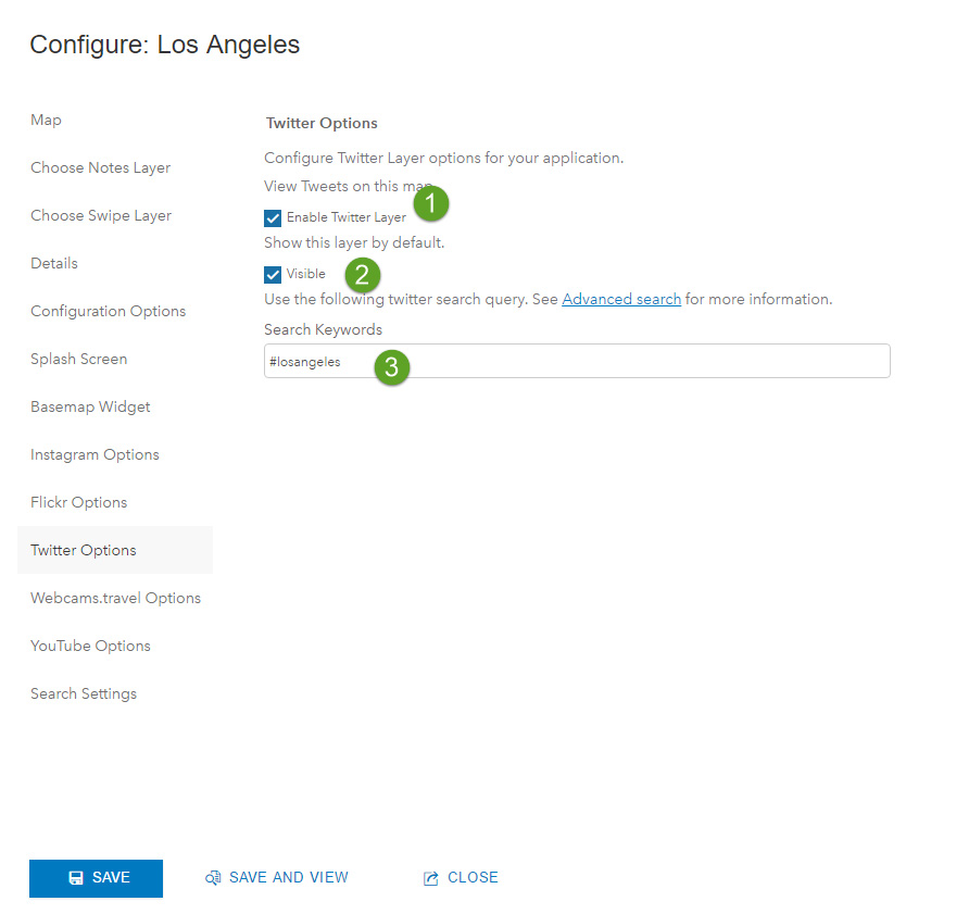 Step 5. Using the configuration panel, configure the application as desired. To display tweets automatically, click the Twitter Options tab and (1) enable the Twitter layer, (2) make the Twitter layer visible by default, and (3) set the search keyword as desired.