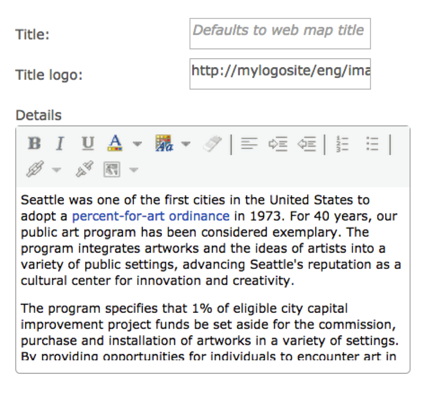 In this example I’m creating a simple app that highlights locations of public art in the City of Seattle. I want to make it easy for people to see where the public art is in Seattle, find art near them if they are in the city and share that information with others. So I’ve disabled all of the tools except the locate button, share tools, details and search.