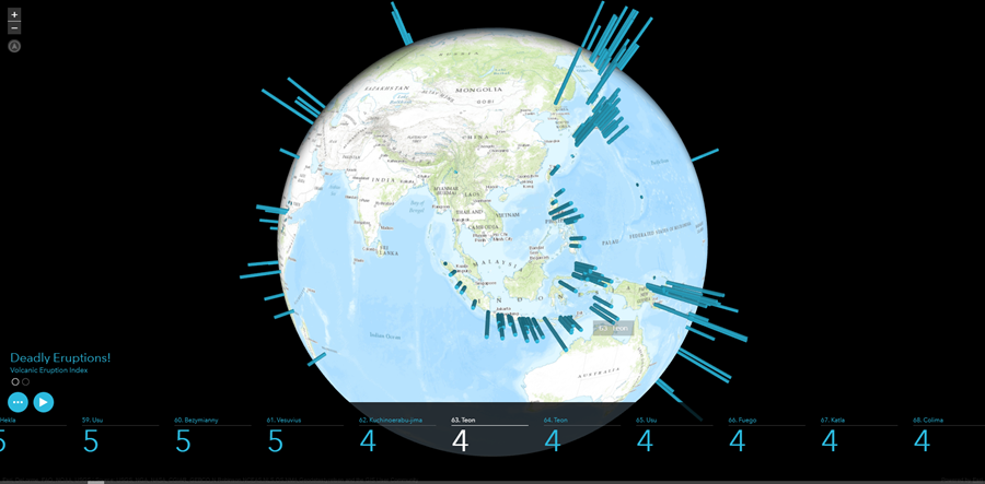 This app is designed to explore numeric attribute data from a feature layer and supports both global and local scenes. Currently, it supports point extrusion where the numeric attribute data is displayed as vertical lines. A play/pause button is present that controls the rotation of the globe and the display of attributes that are visualized. If a global scene is used, the scene is displayed on a rotating globe and the play/pause button controls both the globe rotation and the displayed features. If a local scene is used, the play/pause button only controls the displayed features since a globe will not be present for this type of scene. Other configurable parameters include choosing a web scene, title, color theme, and visualization type (point extrusion is currently supported).
