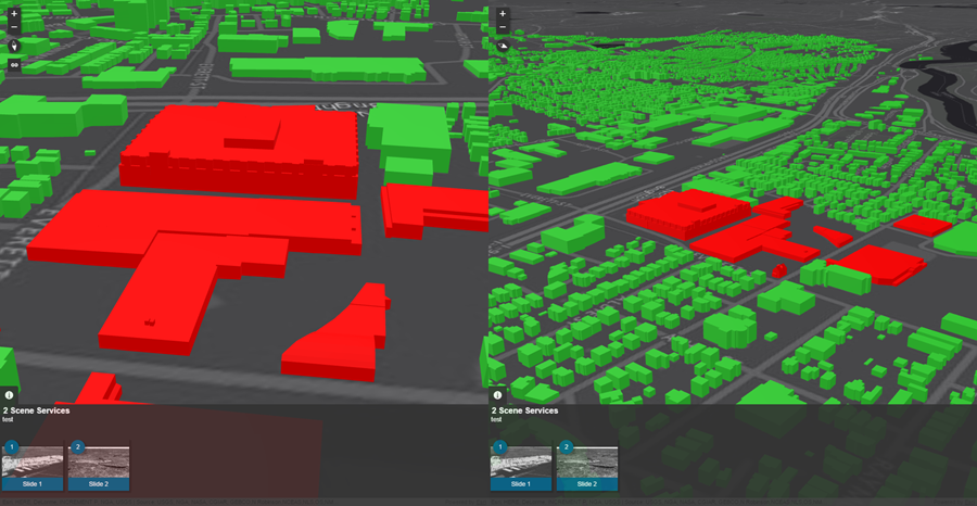 Being able to have different vantage points of your data is a main benefit and purpose of 3D. With this app, different vantage points can be explored even further using side by side comparisons of the same 3D data, or different data for the same geographic area. Like the existing Compare Analysis app, this app uses a side by side layout to provide exploration and visual analysis of multiple 3D web scenes. Currently, up to two web scenes (global or local) are supported for comparing. Within the app, the views can be linked and unlinked using a toggle button. If one or both of the scenes used in the app have slides, these can be displayed and used as well. Configuration parameters include choosing a web scene(s), color theme, including a link view button, and choosing to open information panels on load or not. These panels would include summary text from the web scene(s) and any available slides.