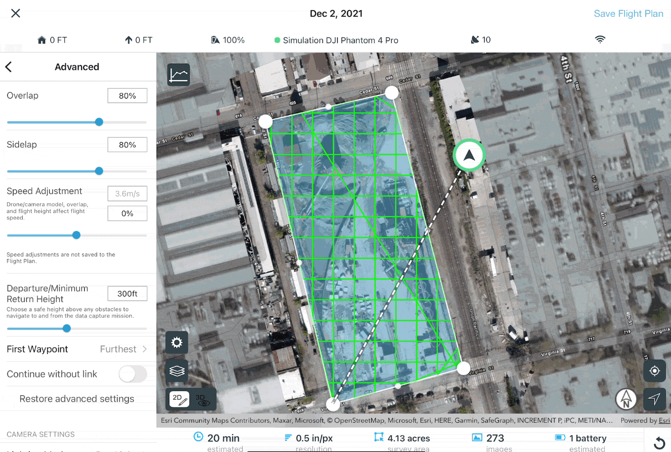 ArcGIS Flight automatically optimizes the drone’s flight speed to ensure sharp images are captured and no images are skipped. These are key elements to process your images into high quality and high accuracy data products. The drone and camera model, flight height and overlap settings all affect the preselected flight speed. With this update, you can now view the default flight speed and manually adjust it to make the drone fly faster or slower.