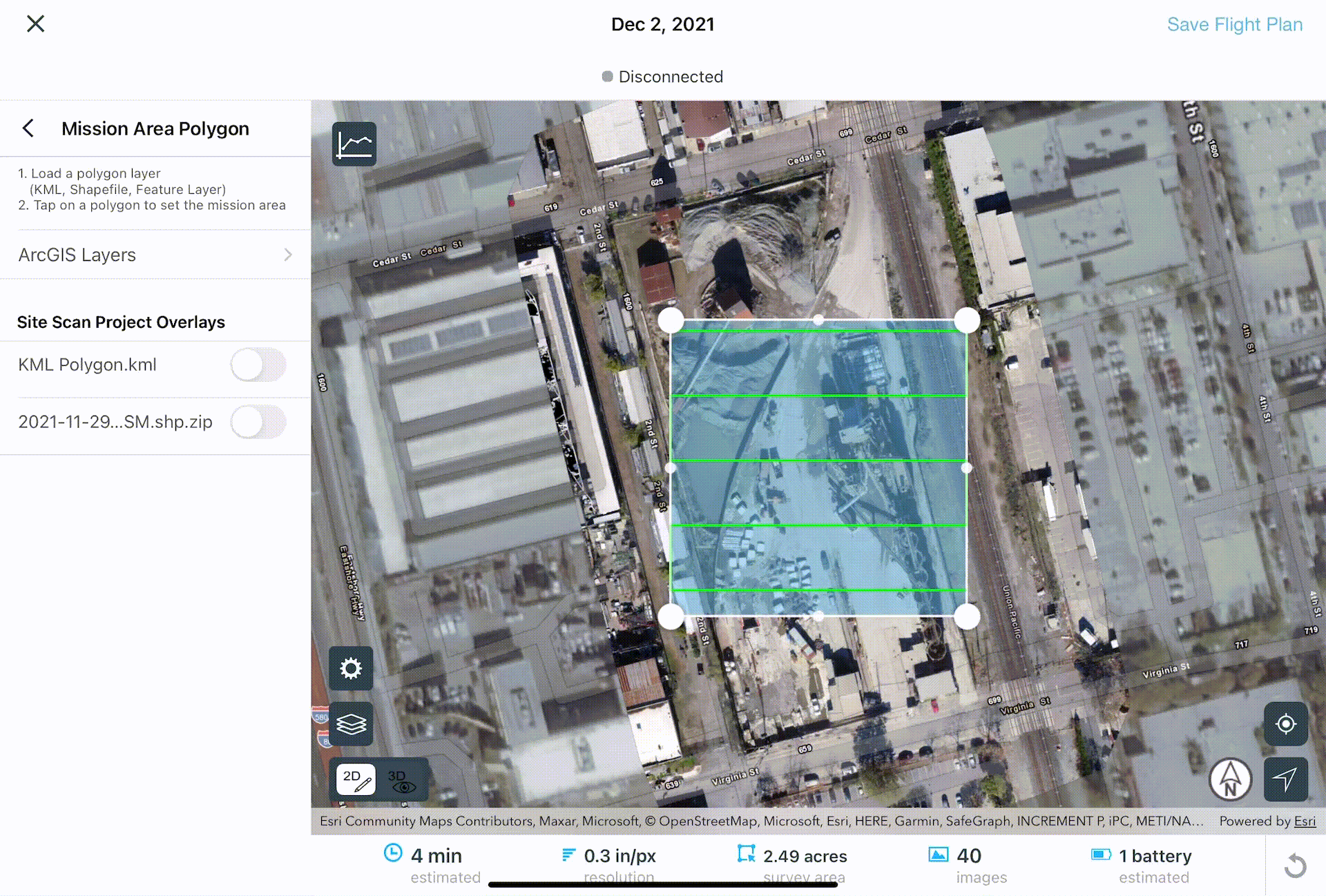 Previously, you were able to view a polygon layer when planning your flights, but had to manually trace the mission area over it. Now, simply display the desired polygon showing the area to be mapped, and tap the area to automatically use it as your mission area boundary.