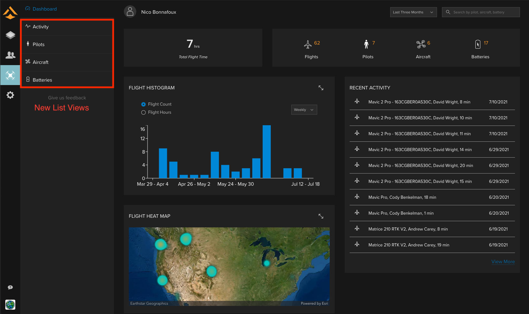 The team has been working very hard to give drone program managers better insight into their drone operations. The new dynamic dashboard provides a high-level view of their entire drone program. At the top are simple visualizations for the total flight time of your drones, how many flights have been flown, how many pilots are in the organization, the number of aircraft and the number of batteries to give you data at a quick glance. Clicking on any of the totals takes you to the list view with detailed data. The number of flights or flight hours are tabulated in a flight histogram that can be adjusted for daily, weekly, or monthly totals. The locations of your drones are automatically tracked in the dynamic flight heat map so you can easily see the locations of your organization’s flight activity in one view.