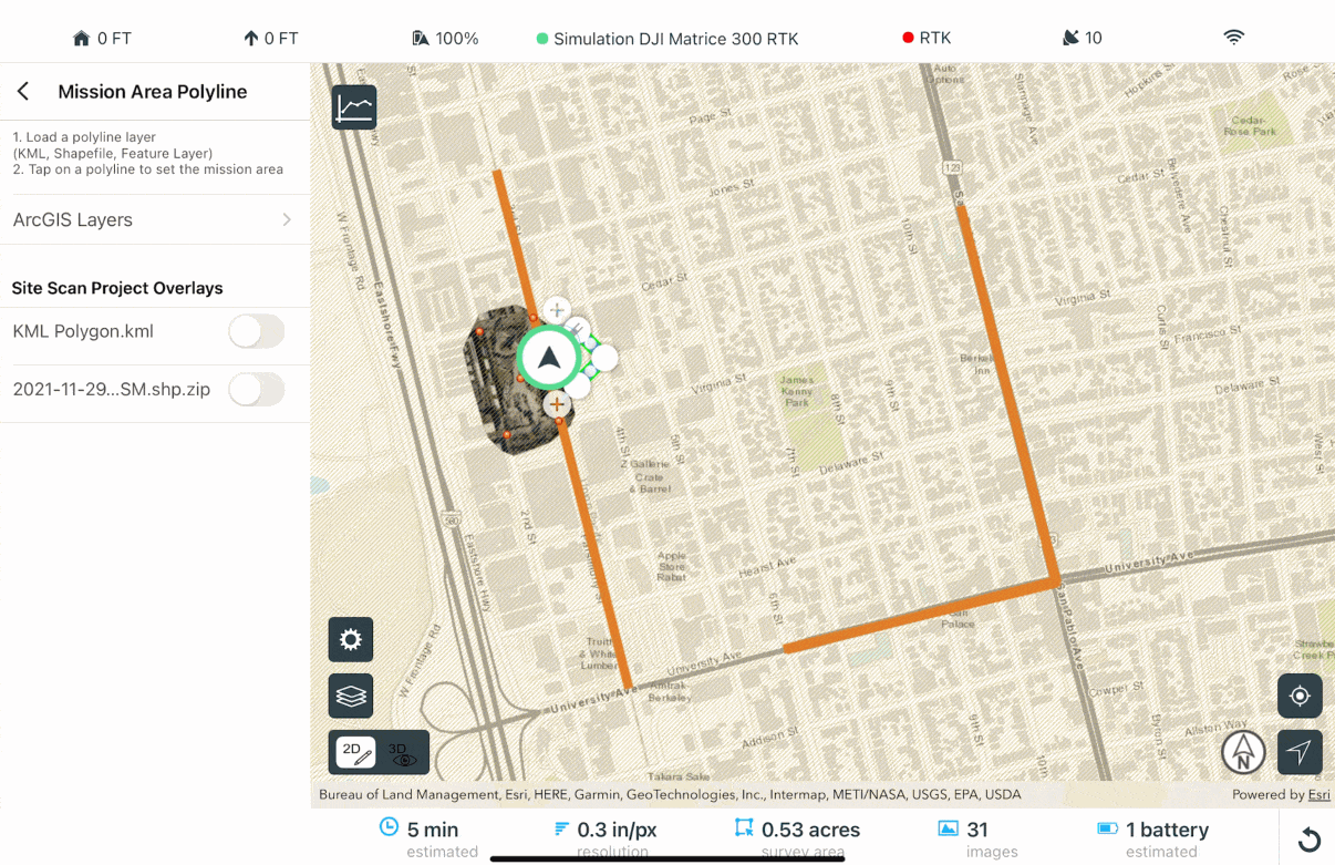 Previously, you were able to view a polyline layer when planning your flights but had to manually trace the mission area over it. Now, simply display the desired polyline showing the area to be mapped and tap the area to automatically use it as your corridor centerline.