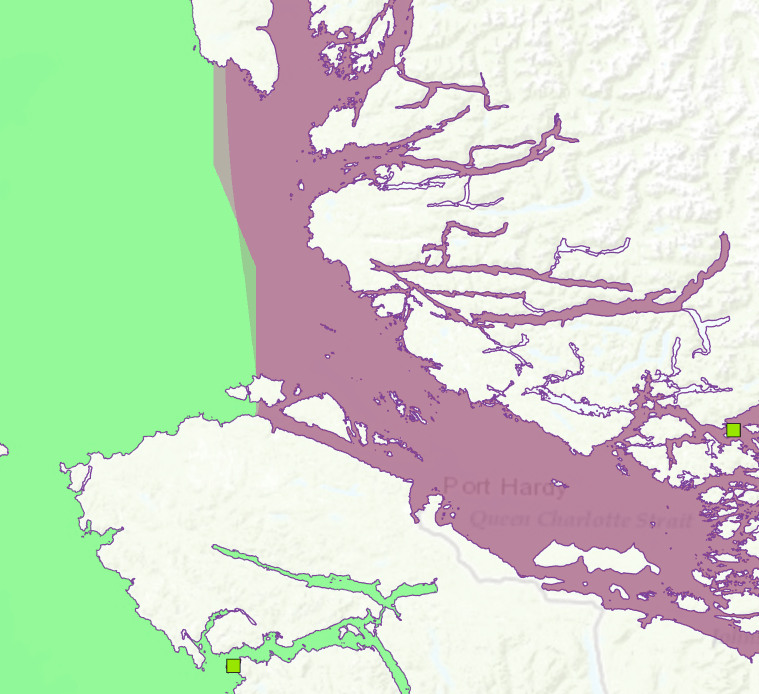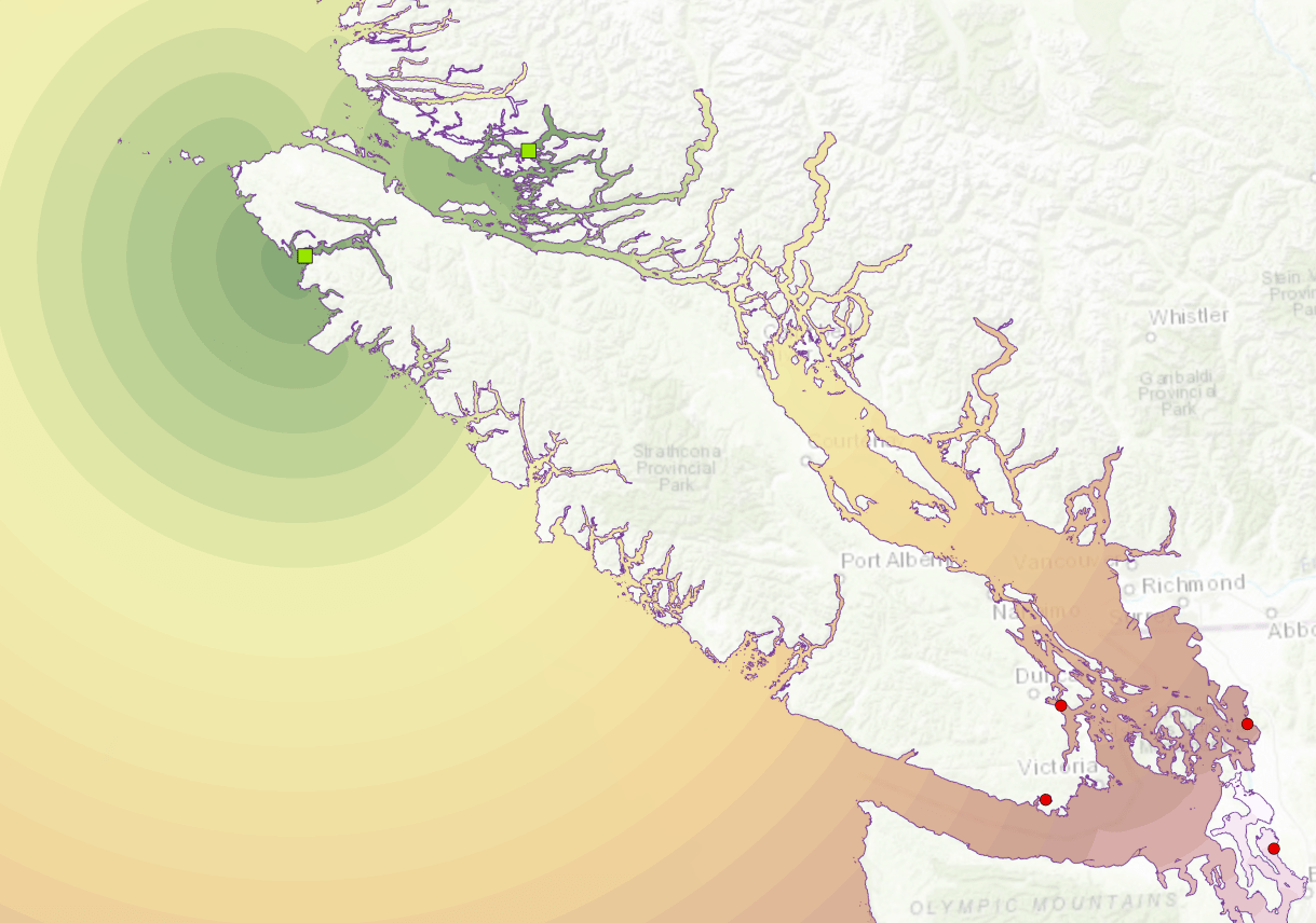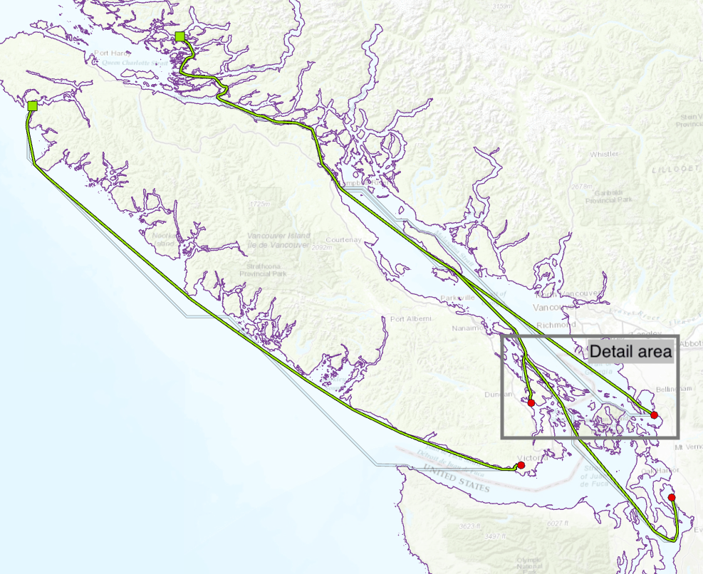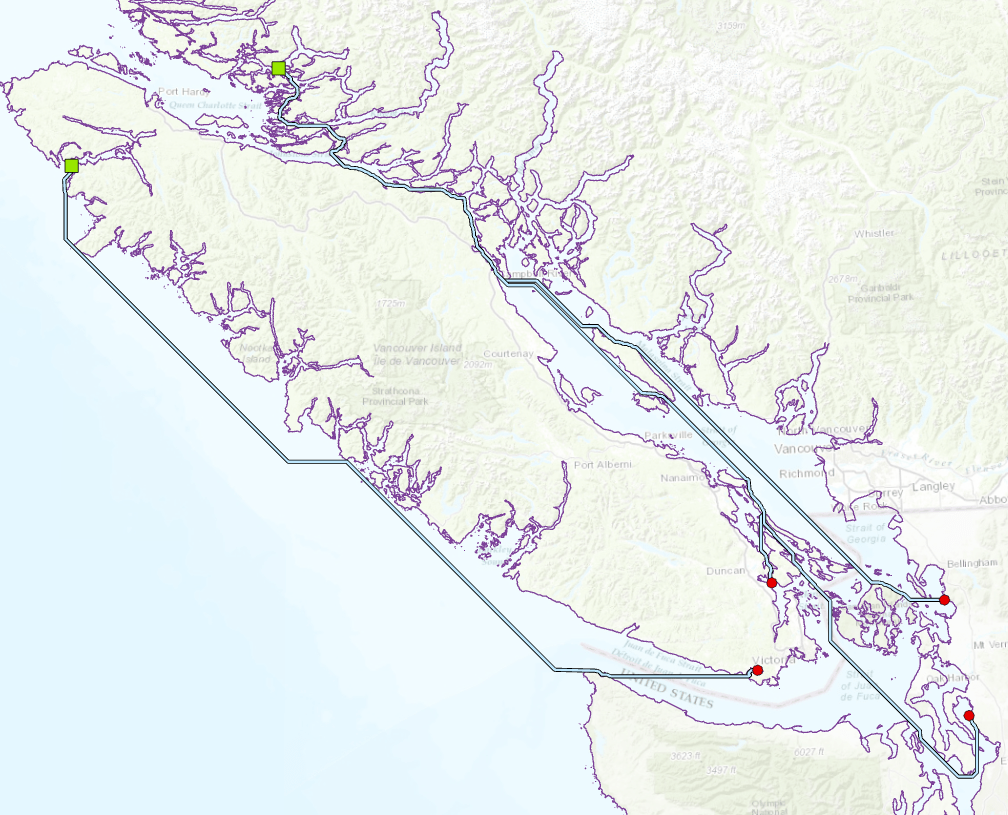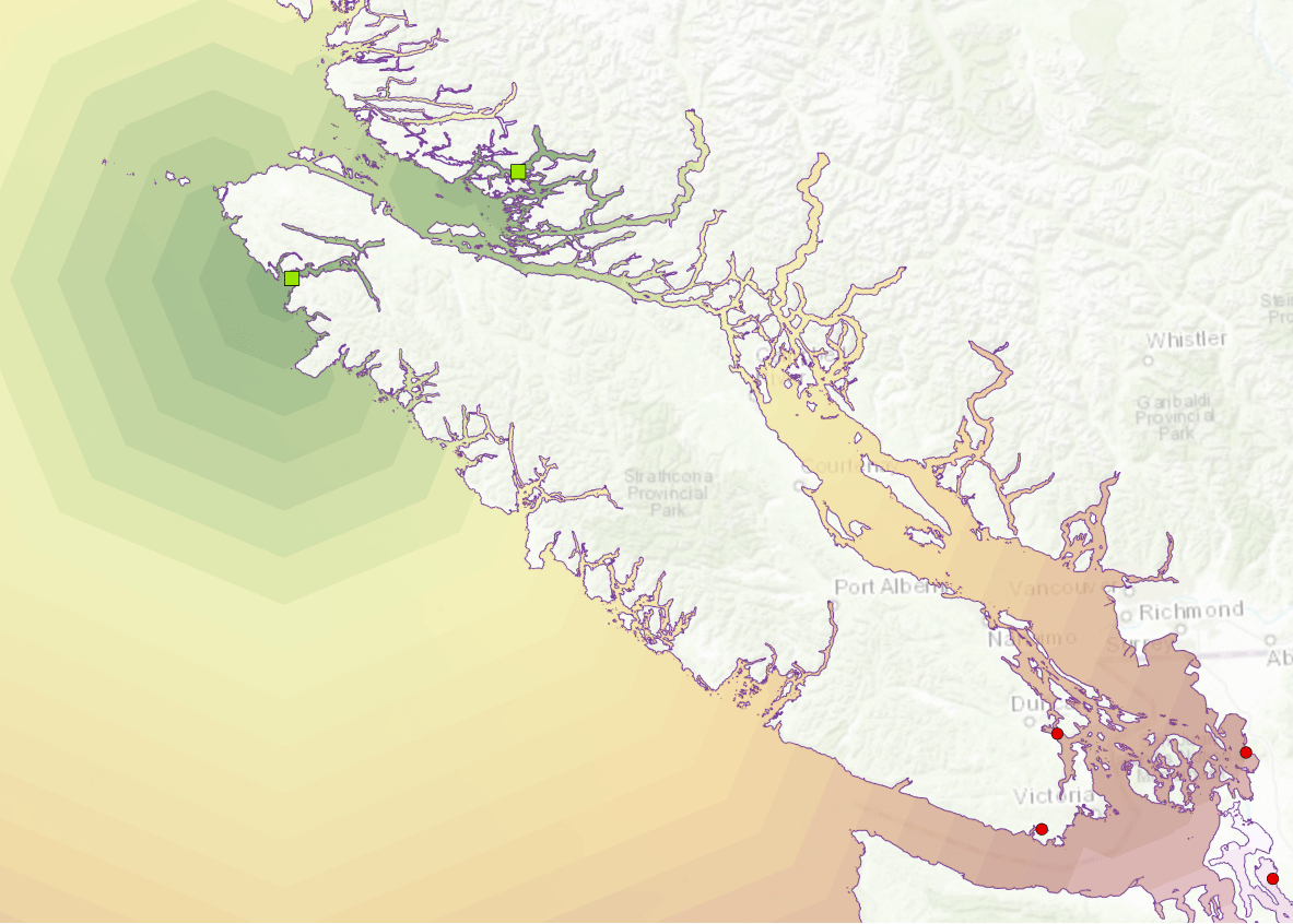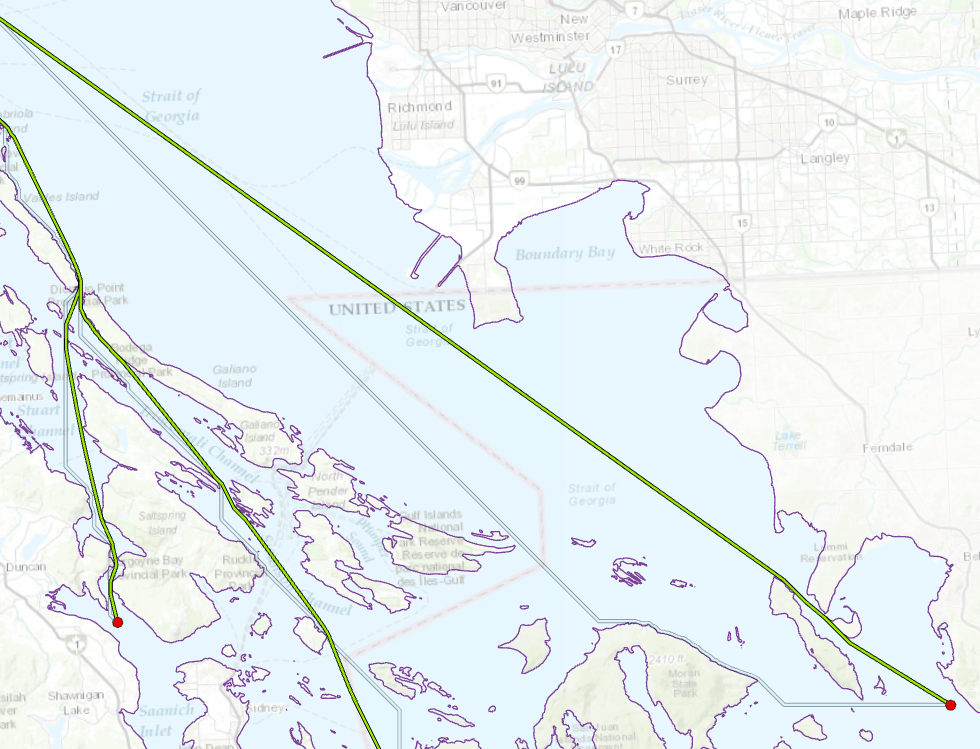 Prior to ArcGIS Pro 2.4/ArcMap 10.7.1, the only way to plot shortest paths around barriers was to use the Cost Distance (CD) tool using a constant cost surface with a small, positive, non-zero cost for the areas where movement was allowed and either a high cost or nodata where movement was prohibited. As the geonet posters point out, the cost paths obtained from this approach are unsatisfactory. To drive this point home, lets recreate the seabird flight paths (using completely fake nesting and feeding site data) using the CD + constant cost surface approach. The study area is Vancouver, British Columbia.