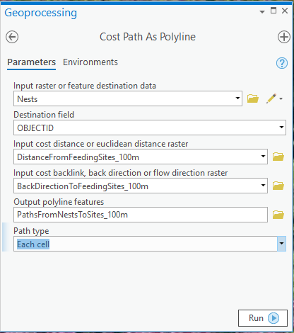 - Use the Cost Path As Polyline tool to create the paths from the destinations (Nesting sites) back to the sources (Feeding Sites). This tool has been enhanced to accept the new back direction output from Euclidean distance: