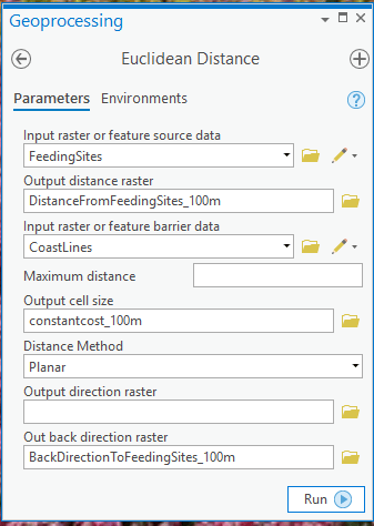 - Use the Euclidean Distance tool instead of the Cost Distance tool. Specify values for the new optional input parameter “Input raster or feature barrier data” and the new optional output parameter “Out back direction raster”, as shown below: