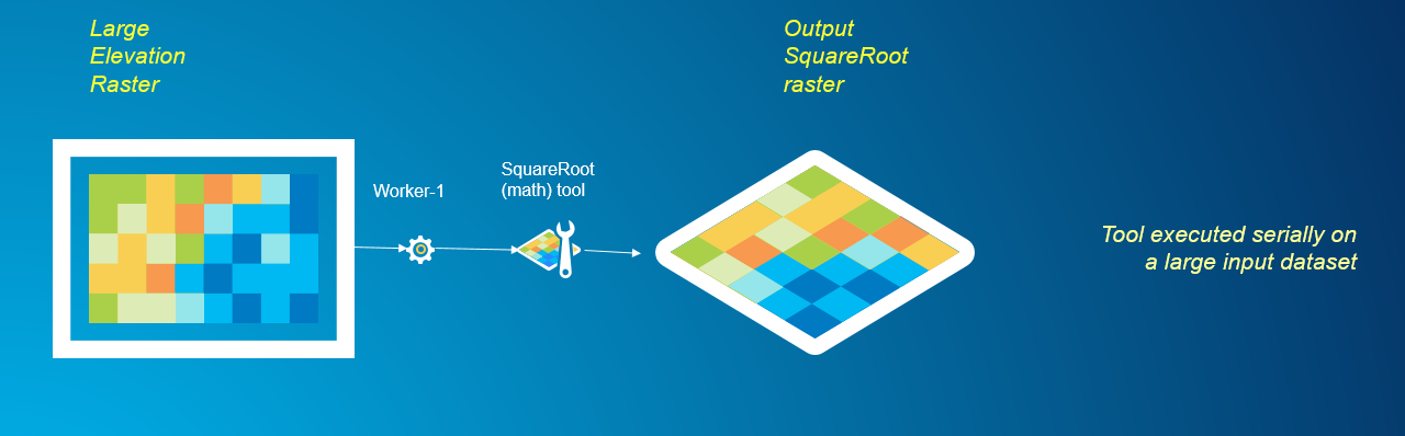 Data decomposition, also known as divide and conquer, is a popular strategy used in parallel computing that we will take advantage of to parallelly process a large raster dataset. The algorithms used in raster analysis tools can be broadly classified into four categories – local, focal, zonal and global operations. For a deeper dive into the types of cell-based raster operations, read this article. Local, focal and zonal raster operations are simple to program with when it comes to data decomposition. Once the data is decomposed appropriately, each data ‘chunk’ can be operated on independently on by a process without the need to communicate with other processes. However, global raster operations are tougher to integrate with data decomposition and require communication between processes. Let us look at an example of processing a large raster dataset using a local math raster operation, Square Root. The Local, or per-cell operations, are the simplest to parallelize using a ‘divide and conquer’ strategy, since the resulting value at each cell only depends on the input value at that cell location. For each cell, the Square Root tool calculates the square root of the value from that cell. Using the tool serially would mean simply running the Square Root tool on the entire large dataset, but, this process can be time consuming.