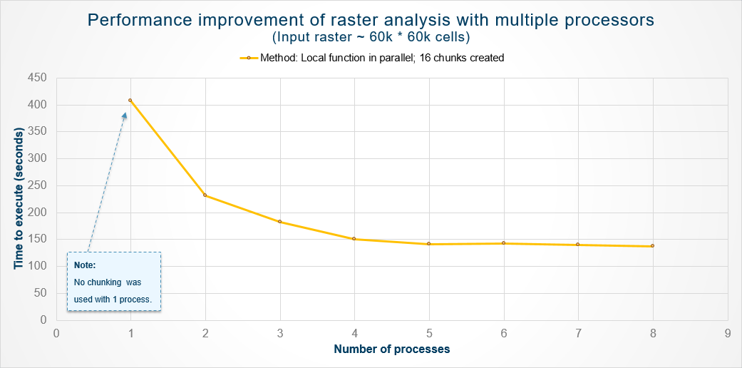 The advantages of optimizing raster analysis tasks with Python multiprocessing are evident from this graph. We can see significant improvements while adding more processes to help with the analysis, especially going from one to four processes. Beyond that, gains were negligible due to the overhead of spawning multiple processes.