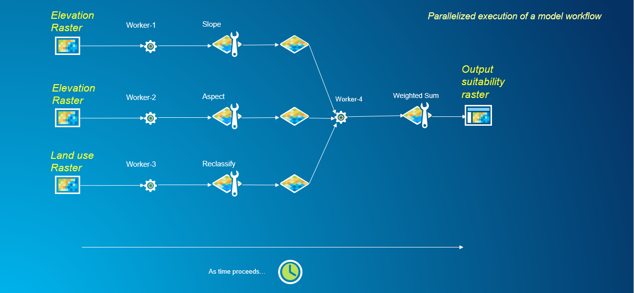 In the above example, as tools are executed in a serial fashion, only one worker process can be utilized at a time to complete the workflow. To parallelize any geoprocessing workflow, the first task is to decompose the problem and identify parts of it that may be handled independently. This workflow is a good candidate for parallel processing as the execution of Slope, Aspect and Reclassify tools are independent tasks. These tasks have no dependencies on the execution of other tools in the workflow. However, the Weighted Sum tool is a dependent task, having dependencies on the outputs from the Slope, Aspect and Reclassify tools. Until the Slope, Aspect and Reclassify tools have finished executing, the Weighted Sum tool cannot begin its analysis. Having identified the independent and dependent tasks within this workflow, we can redesign this problem to parallelize it.