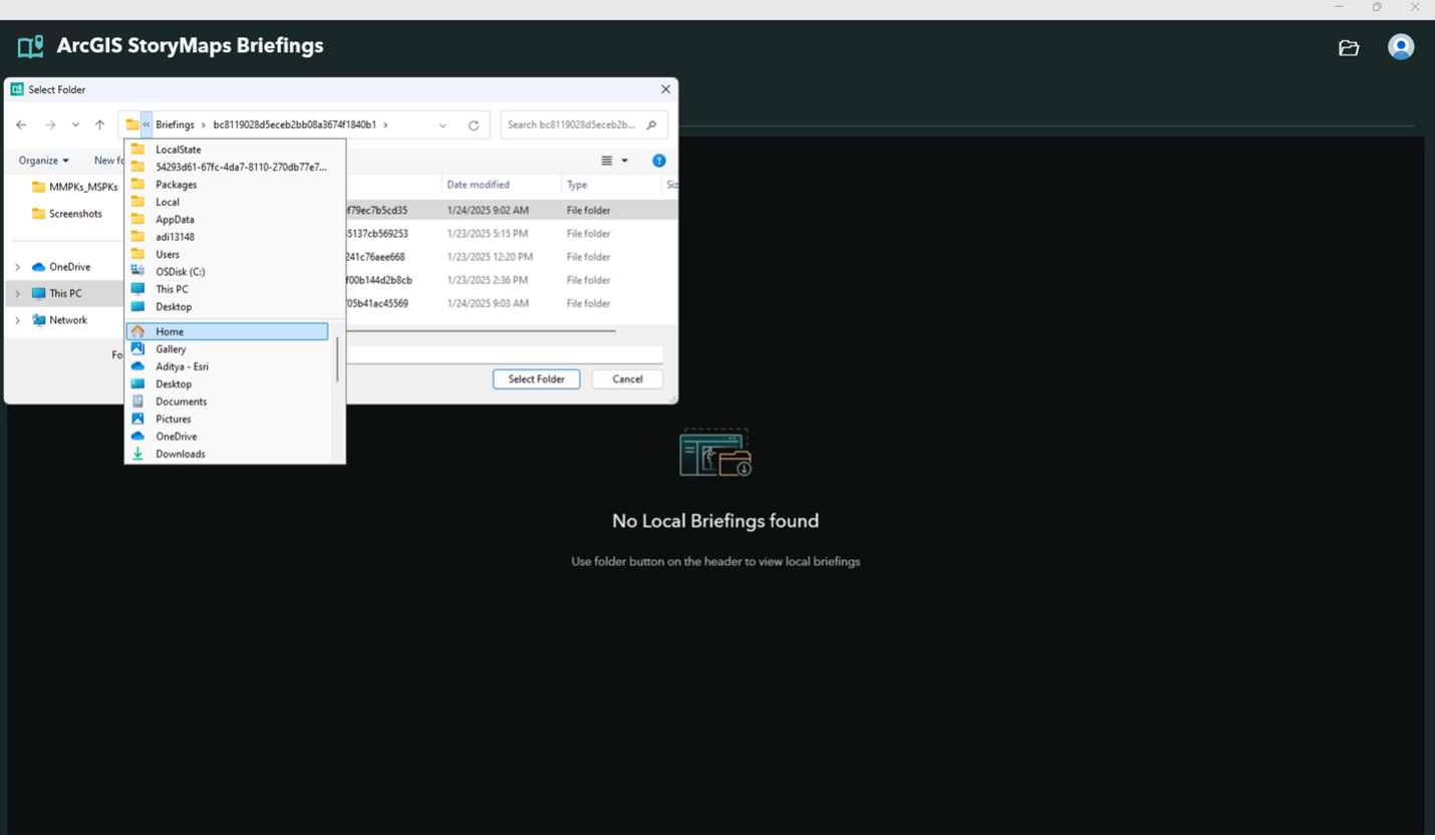 C:\Users\<windows_username>\AppData\Local\Packages\54293d61-67fc-4da7-8110-270db77e7dc2_tnw5vznkpx9jg\LocalState\BriefingsC:\Users\<windows_username>\AppData\Local\Packages\Esri.ArcGISStoryMapsBriefings_eytg3kh68c6a8\LocalState\Briefings- Replace <windows_username> with your actual Windows username.