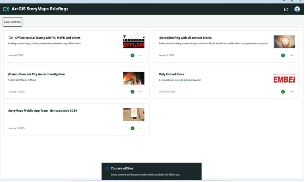 The ArcGIS StoryMaps Briefings app helps you present dynamic maps and more in a visually engaging format offline. It’s perfect for when you need to present critical information in remote locations without internet access. Download the Briefings App today for your iOS or Android tablet or Windows computer or tablet. To learn more about taking your briefings offline, please refer to Present Interactive Maps Offline with the ArcGIS StoryMaps Briefings app.