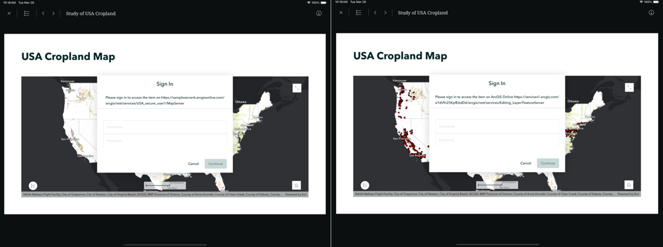 You can now view secure layers in web maps or 3D scenes added to a briefing from the Briefings app. A pop-up will display prompting you to sign-in to your ArcGIS organization to display the secure layers. Upon entering your credentials, the secure layers will display in the web map or 3D scene.