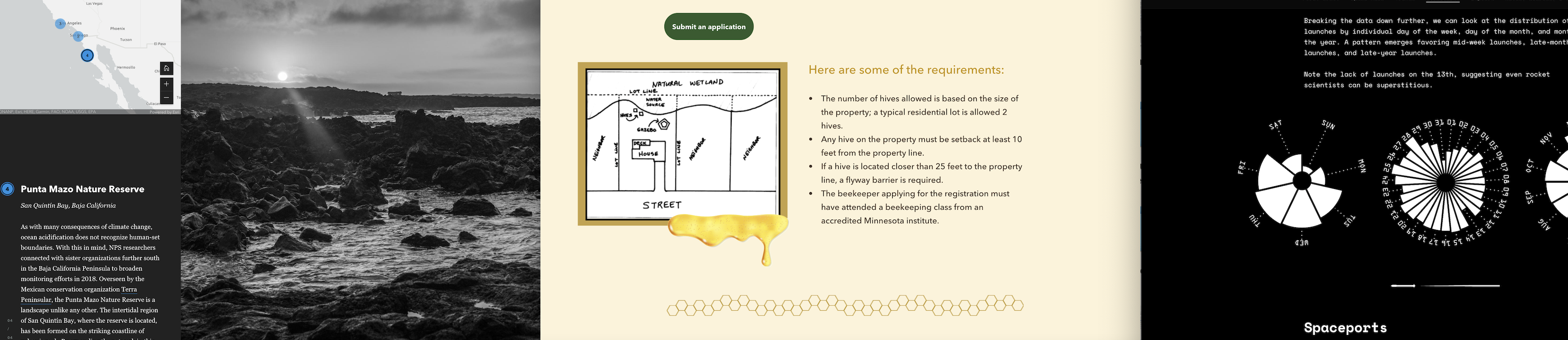 Take Something’s Buzzing! by the City of Brooklyn Park, for instance. In this story, created by GIS intern Maisong Francis, custom honeycomb separators, engaging photography, and a honey-yellow theme keep readers engaged as they learn about the myriad benefits of beekeeping in Brooklyn Park. In contrast, T-Minus 6000, by Aaron Koelker, demonstrates just how effective monochrome can be. This ode to the Space Race employs an impressive all-black-and-white theme and graphics to create a visually dazzling story.