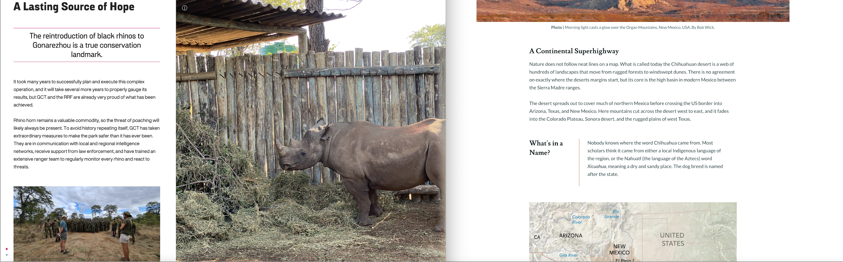 A Homecoming for Gonarezhou’s Black Rhinos by the Rhino Recovery Fund is a prime example of how to use a multitude of different blocks without overwhelming readers. The story artfully weaves together multiple sidecars and a timeline to create a seamless and beautiful call to action for the endangered rhinoceros.