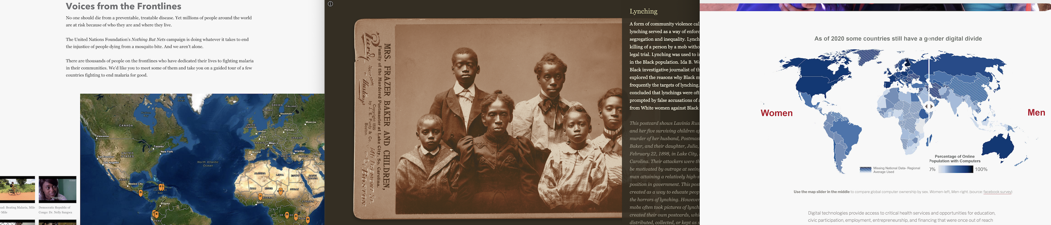 Explore the globe with the UN’s Nothing but Nets campaign as they utilize powerful maps, quotes, and media to share how communities worldwide are fighting to eradicate malaria in Malaria on the Frontlines. Though completely different in topic and approach, these three stories are quintessential examples of the power a story can have.