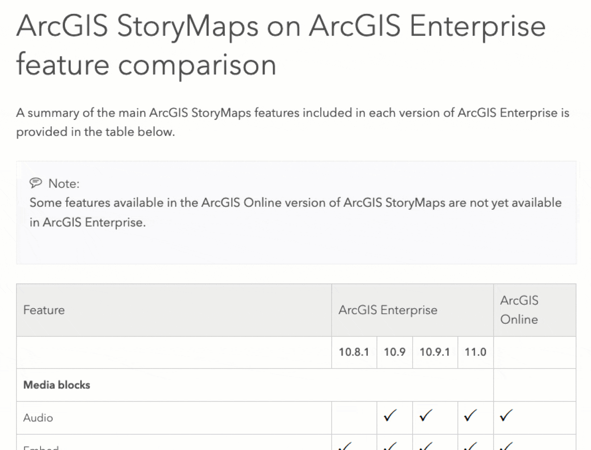 Understandably, not everyone is on ArcGIS Enterprise 11.0 yet. If you are on an earlier release, you can review a detailed list of the capabilities of ArcGIS StoryMaps by release here. Better yet, the team compiled a comparison chart allowing you to see which features are available in ArcGIS Enterprise by release.