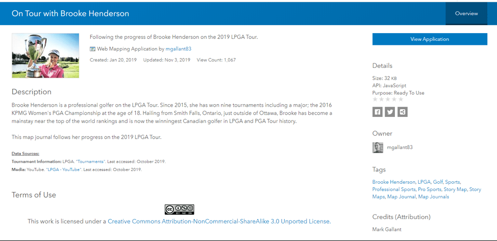 Here’s an example: I followed the 2019 LPGA Tour season of Brooke Henderson, who began the season two wins away from becoming the winningest Canadian professional golfer of all-time. I wanted to (hopefully) capture these next two wins in a Story Map Journal that documented each tournament Brooke played in with an aerial map of the course, her score, and any highlights or snapshots of her rounds that might be publicly available via the official LPGA Tour YouTube page or Instagram feed.