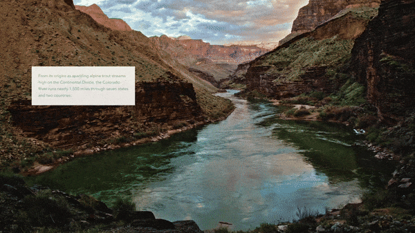 The first slide in Caught in the middle is a gorgeous photo by Amy S. Martin Photography taken from the bottom of the Grand Canyon of the Colorado River flowing into the distance. As the reader scrolls, the image blurs radially, maintaining focus on the river, and a map of the Colorado River Basin is overlaid on the image. Right out of the gate, this effect marries the beauty and majesty of the Colorado River with the vastness of the geography of its basin and all those that depend on its continued flow.