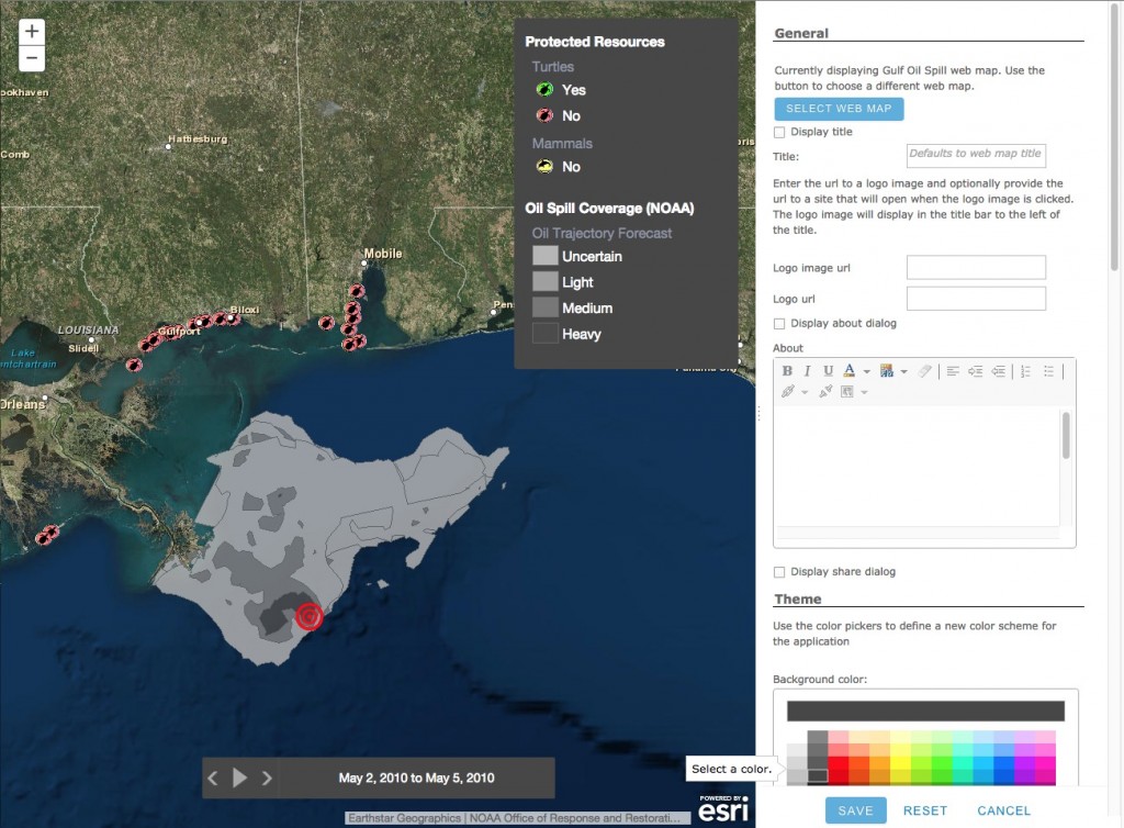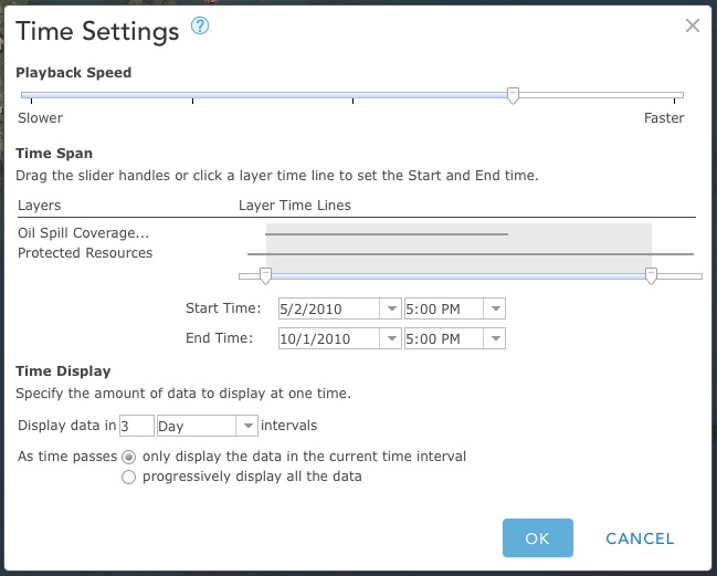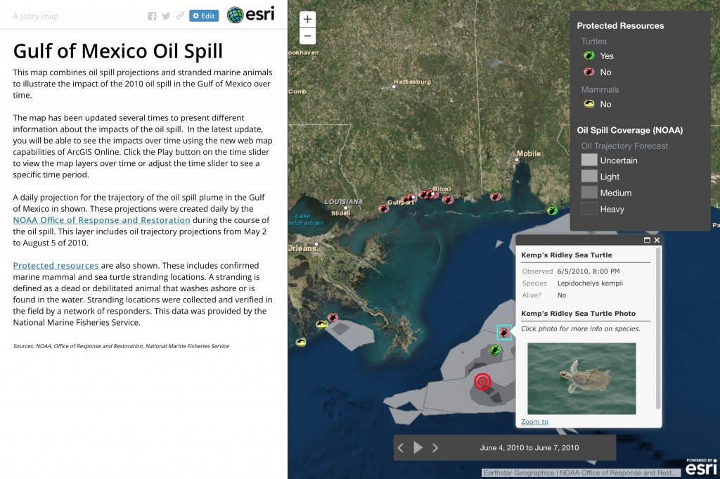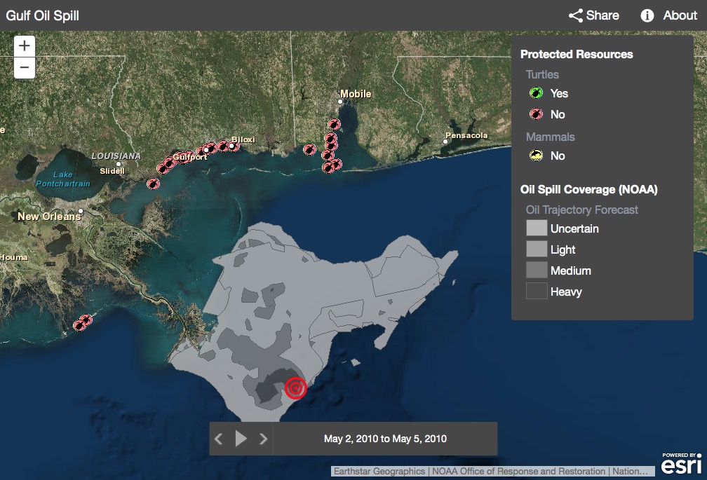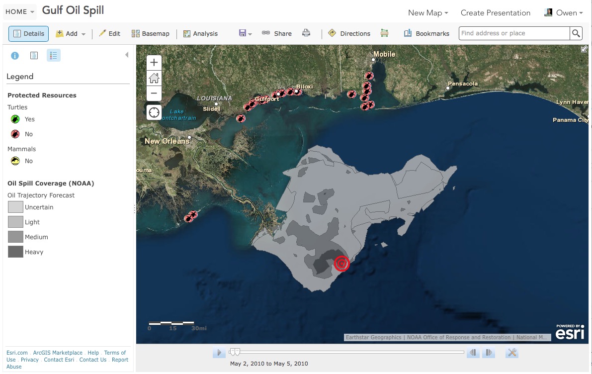 You’ll need to start by making or finding a map that has at least one layer with temporal data like this web map of the 2010 Deepwater Horizon oil spill in the Gulf of Mexico. If you are new to time-enabled layers you can learn more about publishing and configuring time on layers.