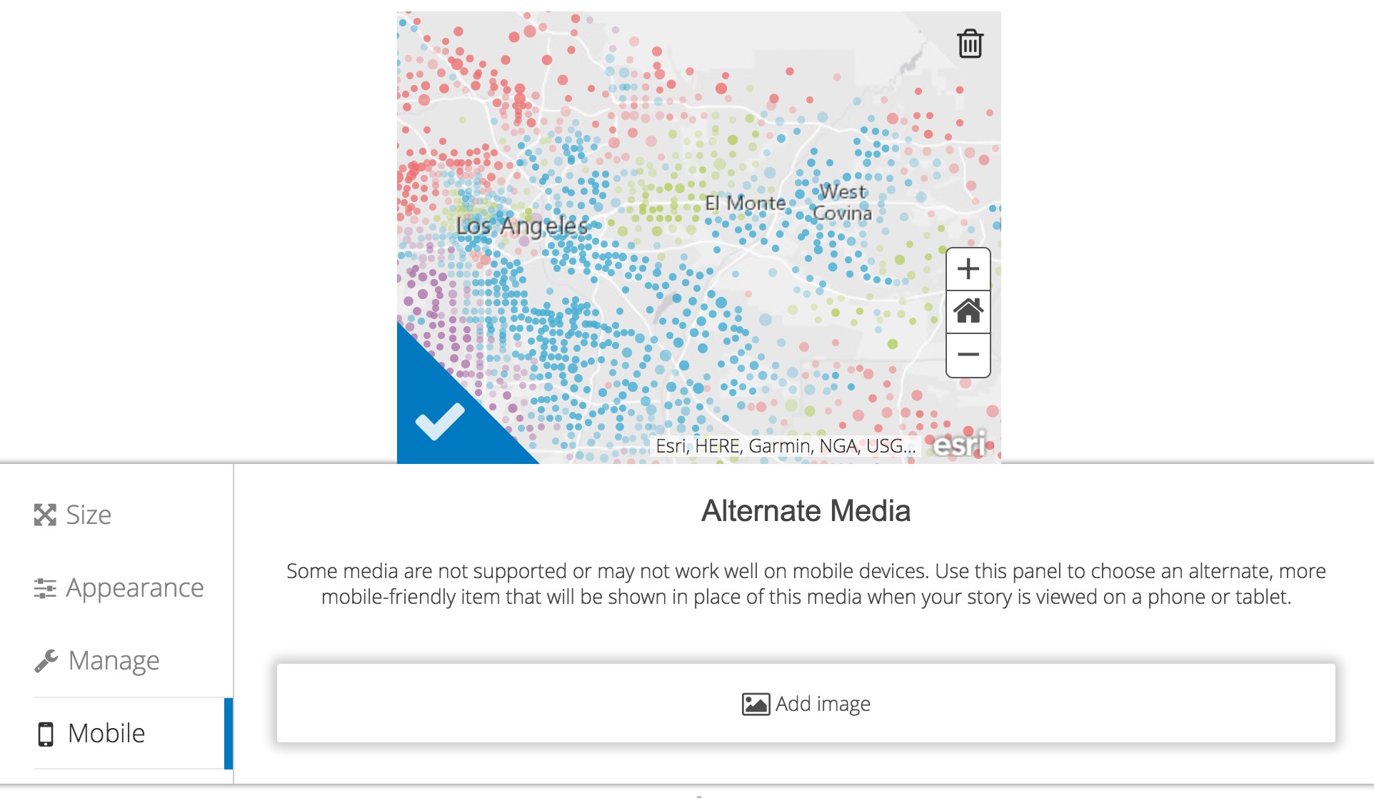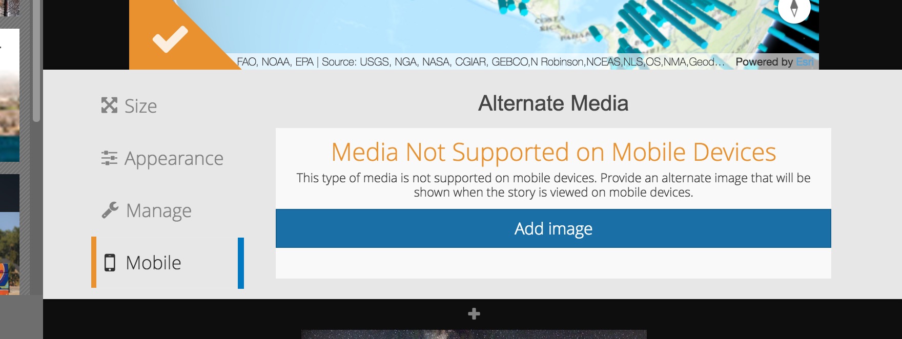 Adding a map anywhere in the story will not trigger a warning; however, you still can provide alternate images for maps, if needed. For example, some complex maps may not perform well on slow data connections. Also, maps with lots of vector tile layers don’t perform well on mobile devices. In these cases, you may want to consider setting an alternate image on the Mobile tab, even though there is no warning. Test your story on mobile devices to see whether you should provide alternate images for your maps.