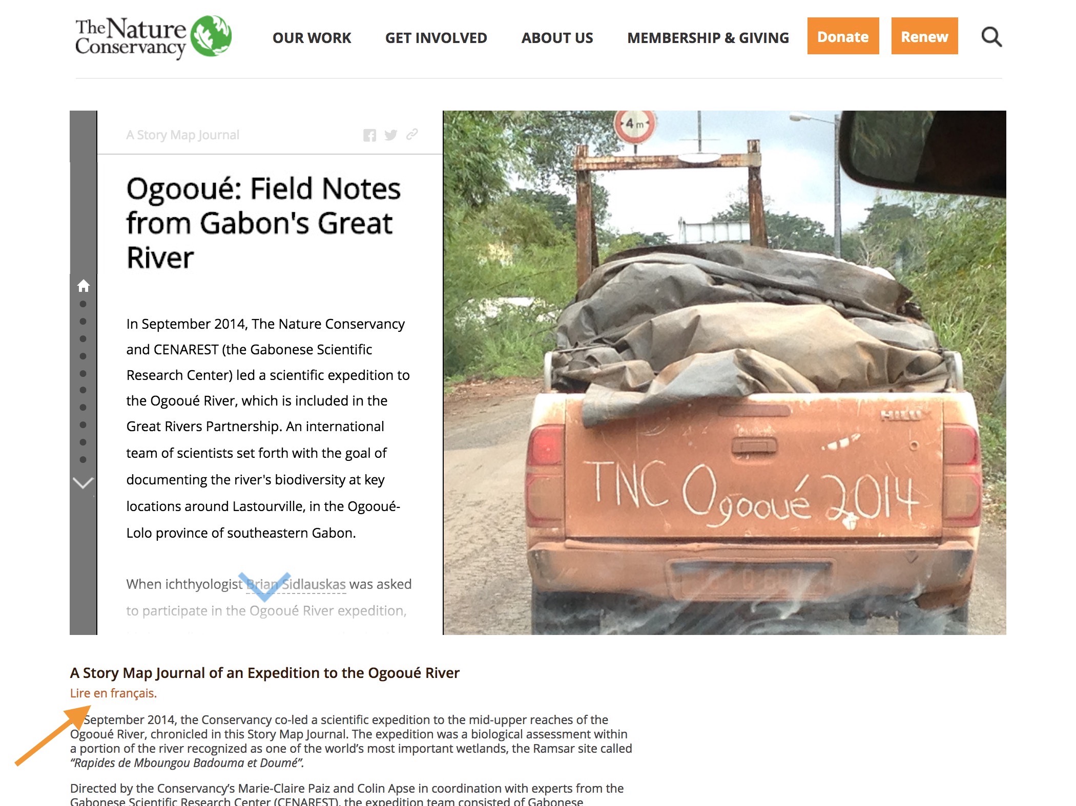 You can also add translated story maps to a page on your organization’s web site. Here’s an example of this from The Nature Conservancy for their Map Journal story about the Ogooué River in Gabon.