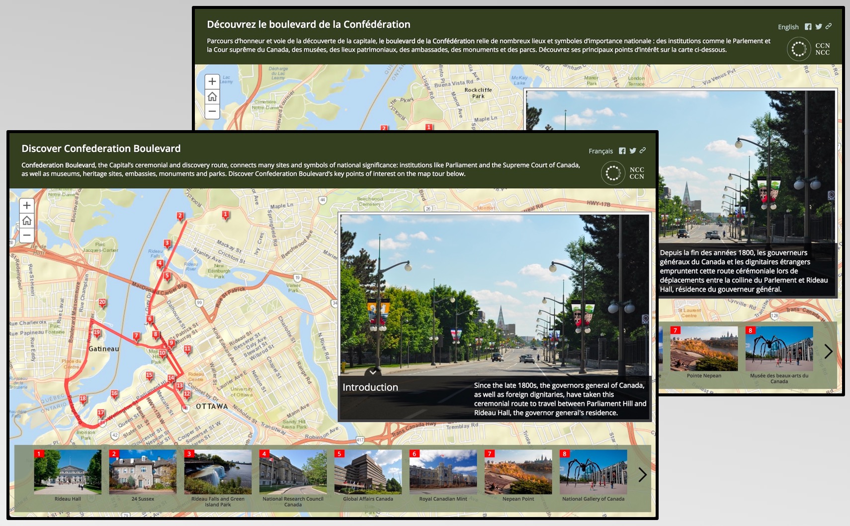 Authors sometimes need to publish a story map in more than one language to effectively reach everyone in their intended audience. For example, employees of governments with two official languages may be required to publish content in both languages. Below is a Map Tour created by the National Capital Commission in Ottawa (available in English and French). Readers can click the link in the top right to load the story in the other language.