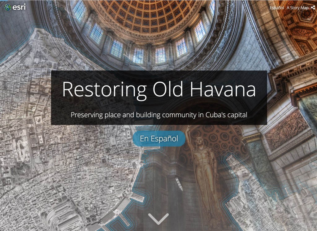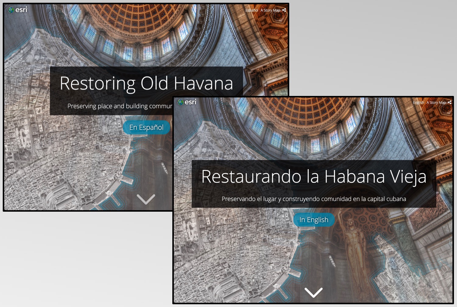 In some cases, the topic of a story may suggest that it should be made available in multiple languages, such as this story by Esri’s Story Maps Team about the restoration of Havana, Cuba (available in English and Spanish). In this case, there is a blue button on the cover that readers can use to read the story in the other language.
