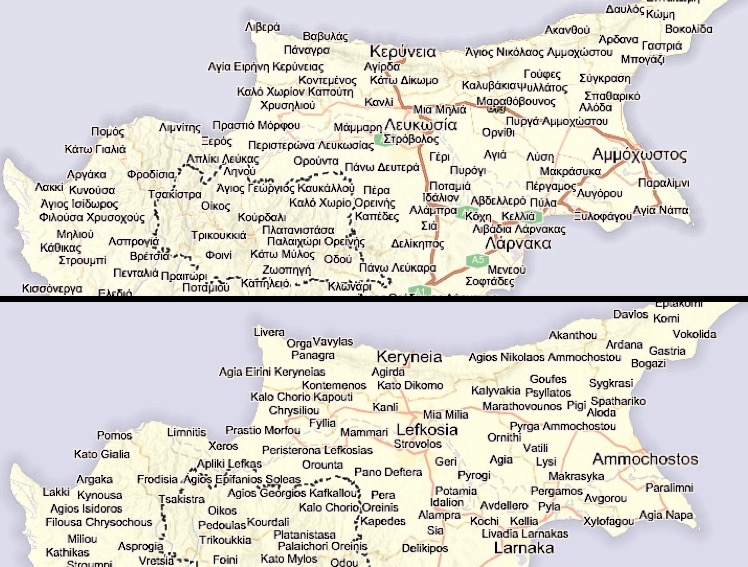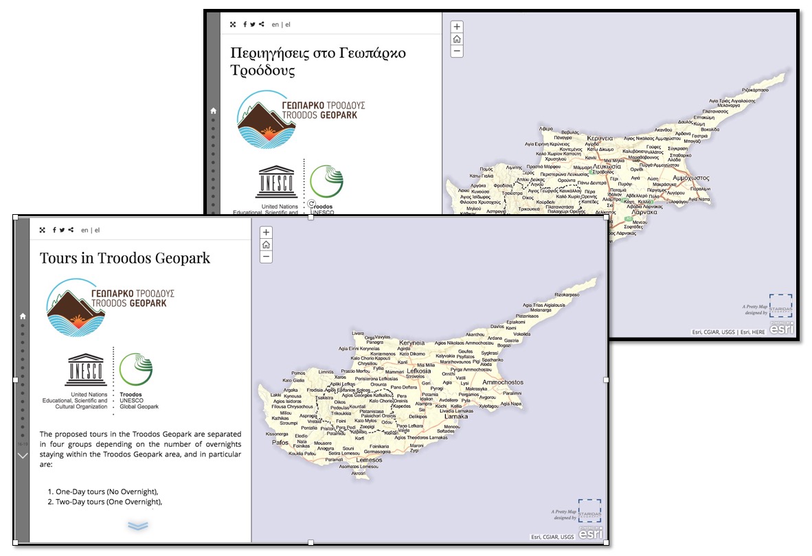 - Create alternate, translated versions of all media elements from the original story. For infographics or charts, be sure to translate any labels or text. For maps, be sure to consider translating labels and pop-up content. Here’s a story from Staridas Geography that’s available in English and Greek that uses different label layers for each language (see screenshots below).