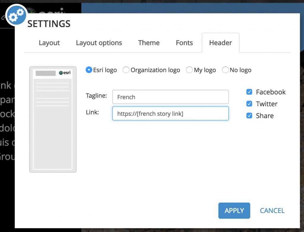 For example, let’s say you have a story that you created using the Story Map Journal app and wrote in English. Then you created another Map Journal for the French translation. For the English version of the story you’d open the Map Journal builder and go to Settings > Header and change the tagline to “French” and the link to the URL of the French story. Then you’d do the same thing in the French version of the story to point the header link to the English version.