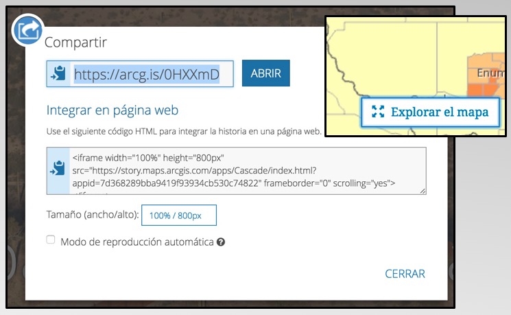 After doing the work to translate your story narrative, you should also make sure the user interface text of the story map app is translated. This includes components like the “Explore Map” button in Cascade and the Share dialog.