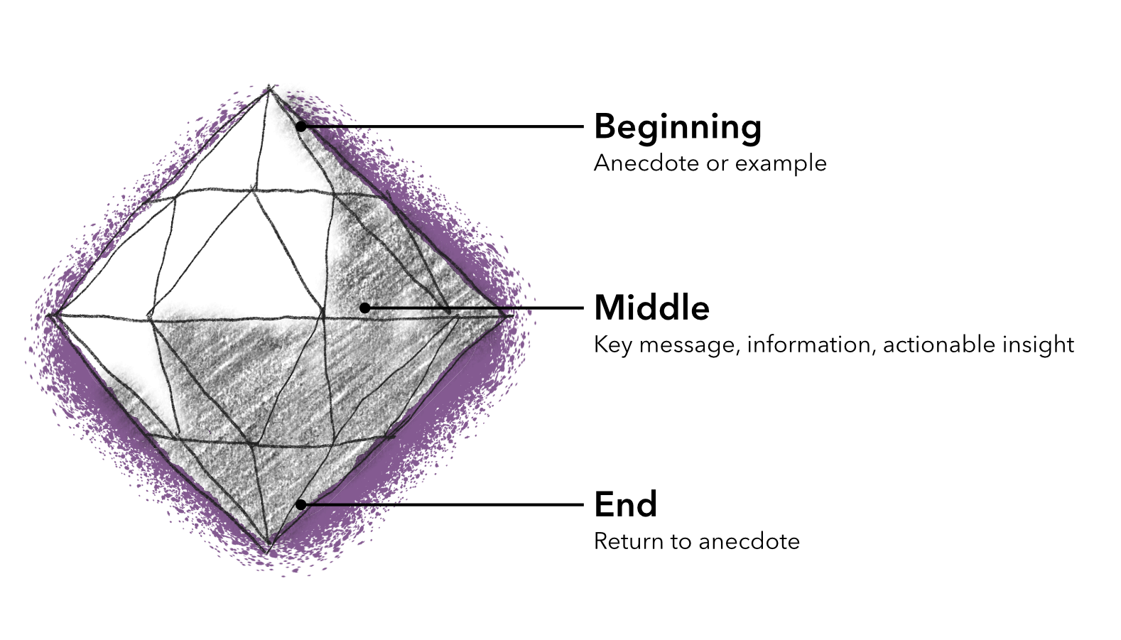 The diamond structure combines the pyramid and inverted pyramid structures, effectively sandwiching the key message between the introduction and conclusion. The diamond structure is well-suited for complex, data-driven stories whose insights are best communicated through anecdotes or local perspectives.